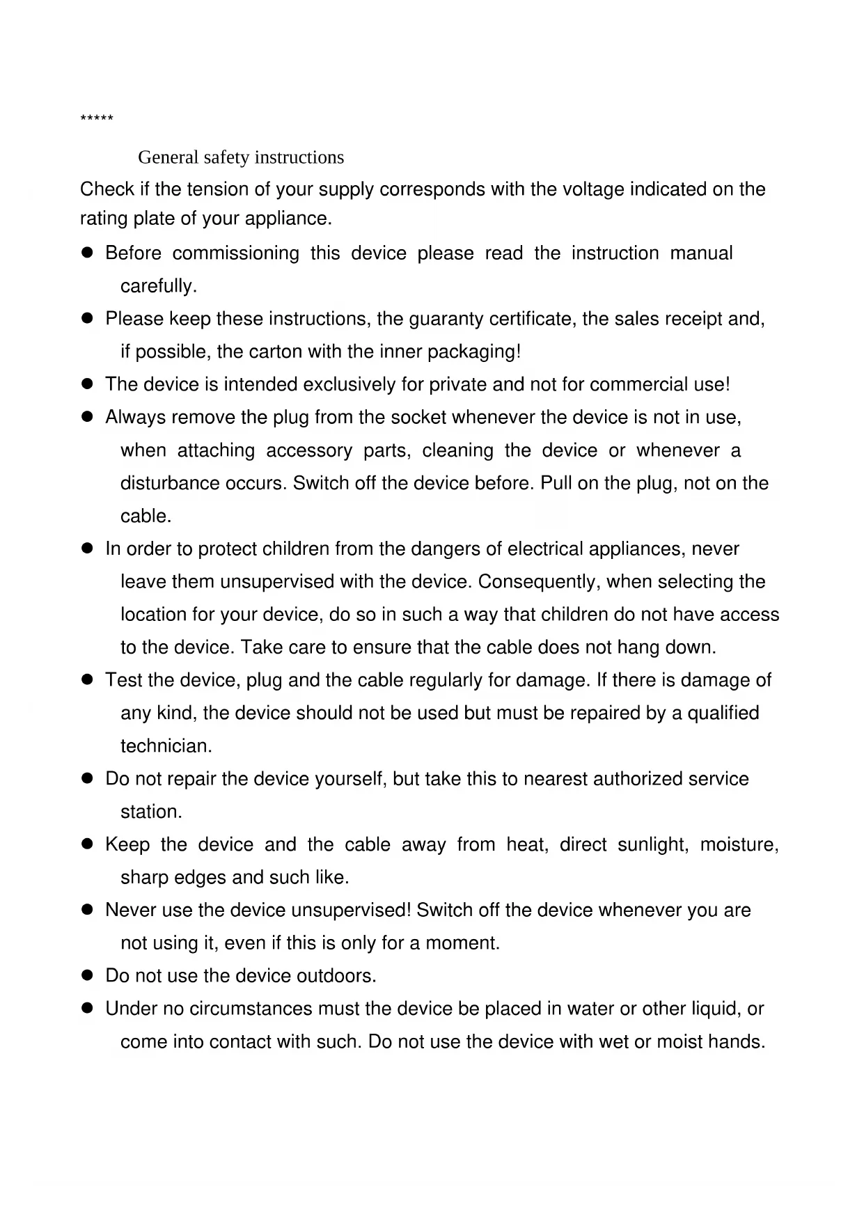 come into contact with such. Do not use the device with wet or moist hands. Should the device become moist or wet, remove the mains plug from the