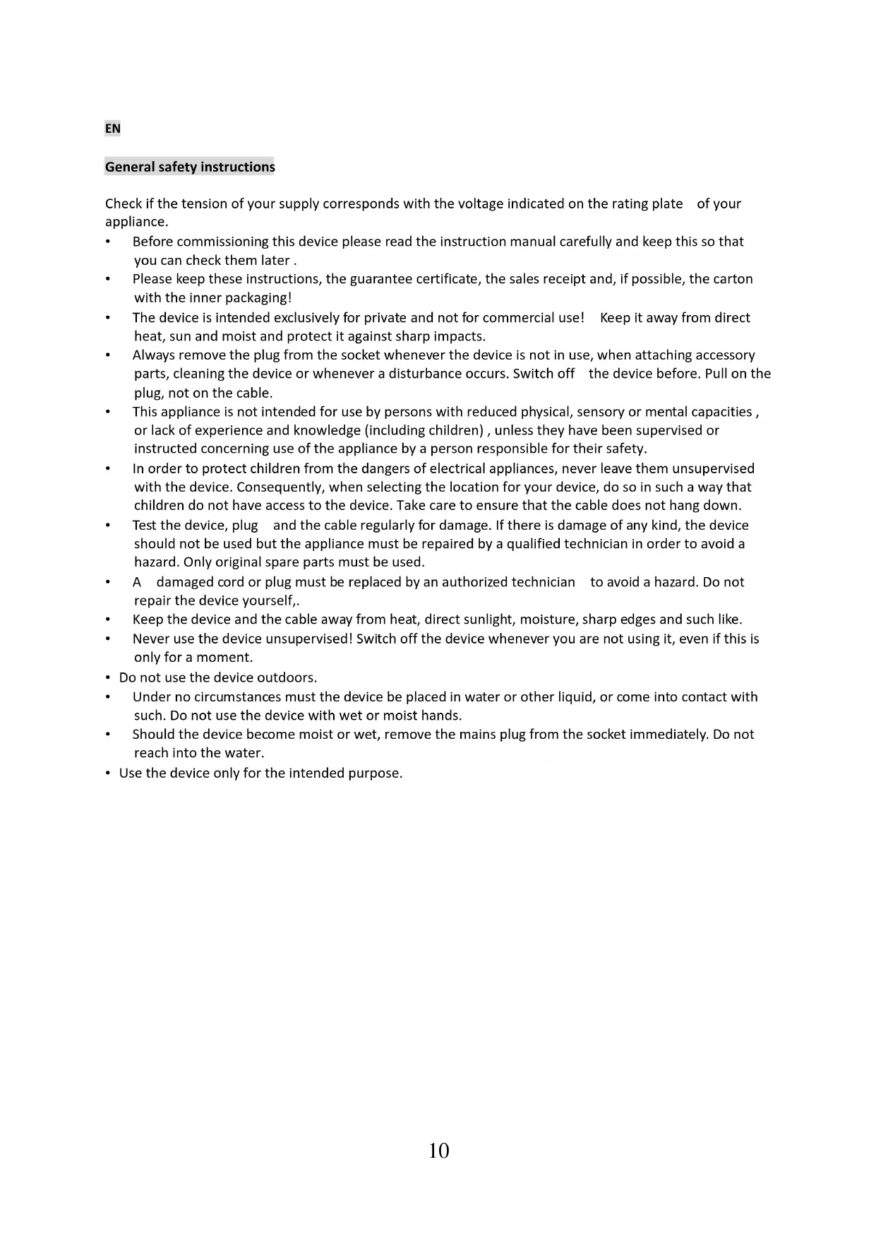 • The device is intended exclusively for private and not for commercial use! Keep it away from direct