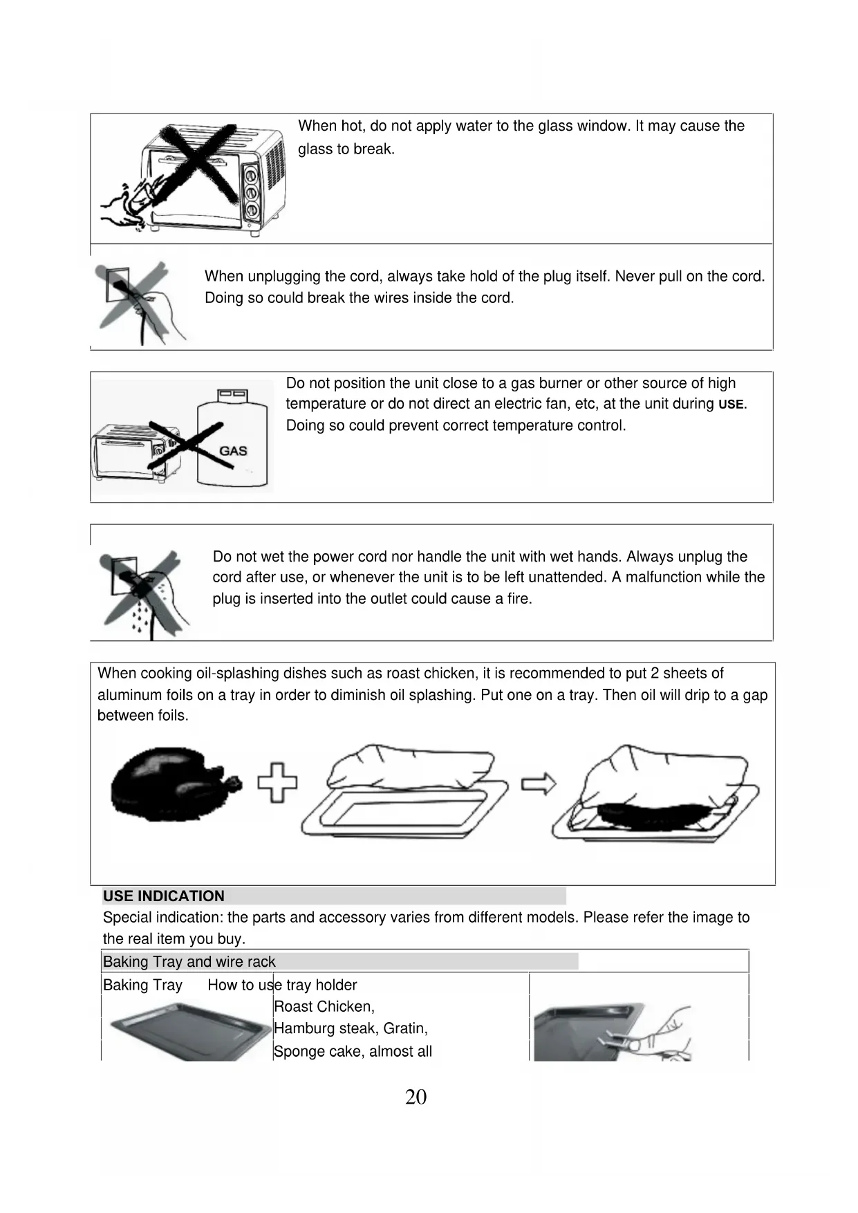 Do not wet the power cord nor handle the unit with wet hands. Always unplug the cord after use, or whenever the unit is to be left unattended. A malfunction while the plug is inserted into the outlet could cause a fire. When cooking oil-splashing dishes such as roast chicken, it is recommended to put 2 sheets of aluminum foils on a tray in order to diminish oil splashing. Put one on a tray. Then oil will drip to a gap between foils.