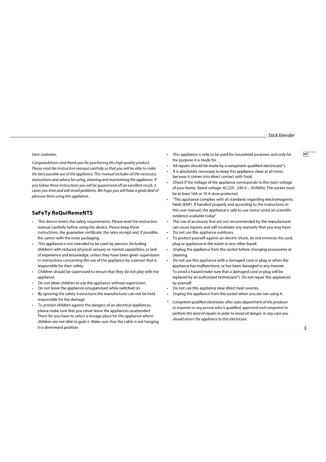 - Competent qualied electrician: after sales department of the producer or importer or any person who is qualied, approved and competent to perform this kind of repairs in order to avoid all danger. In any case you should return the appliance to this electrician. Stick blender1