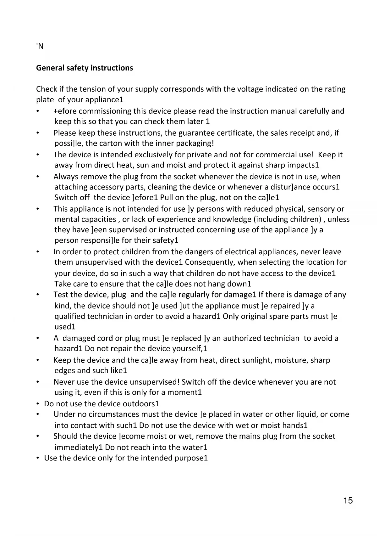 - Test the device, plug and the cable regularly for damage. If there is damage of any kind, the device should not be used but the appliance must be repaired by a qualified technician in order to avoid a hazard. Only original spare parts must be used.
