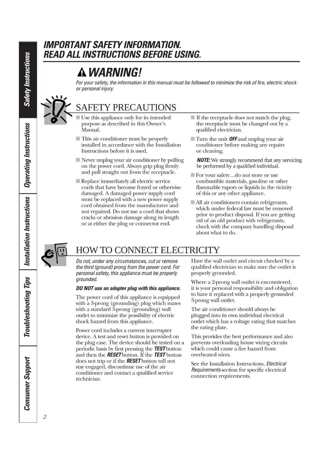 IMPORTANT SAFETY INFORMATION. READ ALL INSTRUCTIONS BEFORE USING. WARNING! For your safety, the information in this manual must be followed to minimize the risk of fire, electric shock or personal injury. ■ Use this appliance only for its intended purpose as described in this Owner’s Manual. ■ This air conditioner must be properly installed in accordance with the Installation Instructions before it is used. ■ Never unplug your air conditioner by pulling on the power cord. Always grip plug firmly and pull straight out from the receptacle. ■ Replace immediately all electric service cords that have become frayed or otherwise damaged. A damaged power supply cord must be replaced with a new power supply cord obtained from the manufacturer and not repaired. Do not use a cord that shows cracks or abrasion damage along its length or at either the plug or connector end. ■ If the receptacle does not match the plug, the receptacle must be changed out by a qualified electrician. ■ Turn the unit OFF and unplug your air conditioner before making any repairs or cleaning. NOTE: We strongly recommend that any servicing be performed by a qualified individual. ■ For your safety…do not store or use combustible materials, gasoline or other flammable vapors or liquids in the vicinity of this or any other appliance. ■ All air conditioners contain refrigerants, which under federal law must be removed prior to product disposal. If you are getting rid of an old product with refrigerants, check with the company handling disposal about what to do. SAFETY PRECAUTIONS Do not, under any circumstances, cut or remove the third (ground) prong from the power cord. For personal safety, this appliance must be properly grounded. DO NOT use an adapter plug with this appliance. The power cord of this appliance is equipped with a 3-prong (grounding) plug which mates with a standard 3-prong (grounding) wall outlet to minimize the possibility of electric shock hazard from this appliance. Power cord includes a current interrupter device. A test and reset button is provided on the plug case. The device should be tested on a periodic basis by first pressing the TEST button and then the RESET button. If the TEST button does not trip or if the RESET button will not stay engaged, discontinue use of the air conditioner and contact a qualified service technician. Have the wall outlet and circuit checked by a qualified electrician to make sure the outlet is properly grounded. Where a 2-prong wall outlet is encountered, it is your personal responsibility and obligation to have it replaced with a properly grounded 3-prong wall outlet. The air conditioner should always be plugged into its own individual electrical outlet which has a voltage rating that matches the rating plate. This provides the best performance and also prevents overloading house wiring circuits which could cause a fire hazard from overheated wires. See the Installation Instructions, Electrical Requirements section for specific electrical connection requirements.