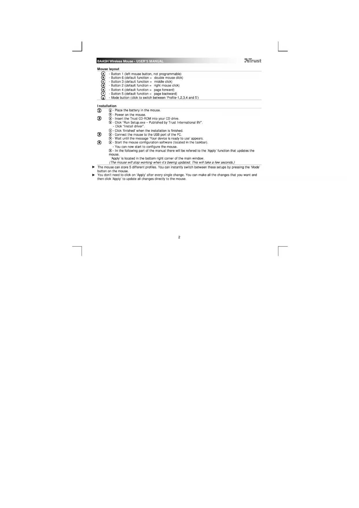 - Place the battery in the mouse. - Power on the mouse. - Insert the Trust CD-ROM into your CD drive. - Click “Run Setup.exe – Published by Trust International BV”. - Click “Install driver”. - Click ‘finished’ when the installation is finished. - Connect the mouse to the USB port of the PC. - Wait until the message ‘Your device is ready to use’ appears. - Start the mouse configuration software (located in the taskbar). - You can now start to configure the mouse. - In the following part of the manual there will be refered to the ‘Apply’ function that updates the mouse. ‘Apply’ is located in the bottom right corner of the main window. (The mouse will stop working when it’s beeing updated. This will take a few seconds.) The mouse can store 5 different profiles. You can instantly switch between these setups by pressing the ‘Mode’ button on the mouse. You don’t need to click on ‘Apply’ after every single change. You can make all the changes that you want and then click ‘Apply’ to update all changes directly to the mouse.BAASH Wireless Mouse - USER’S MANUAL