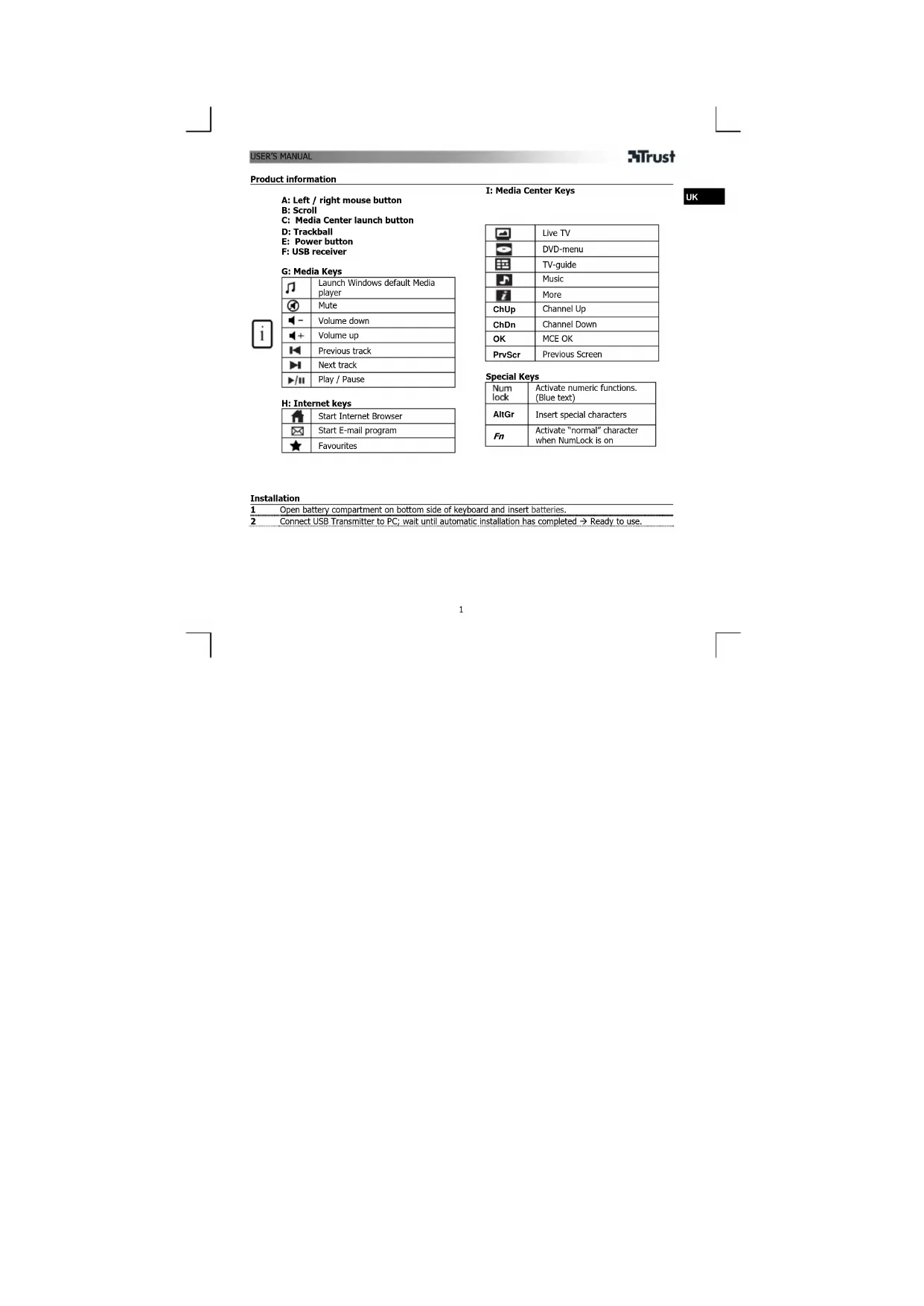 A: Left / right mouse button B: Scroll C: Media Center launch button D: Trackball E: Power button F: USB receiver G: Media Keys Launch Windows default Media player Mute Volume down Volume up Previous track Next track Play / Pause H: Internet keys Start Internet Browser Start E-mail program Favourites