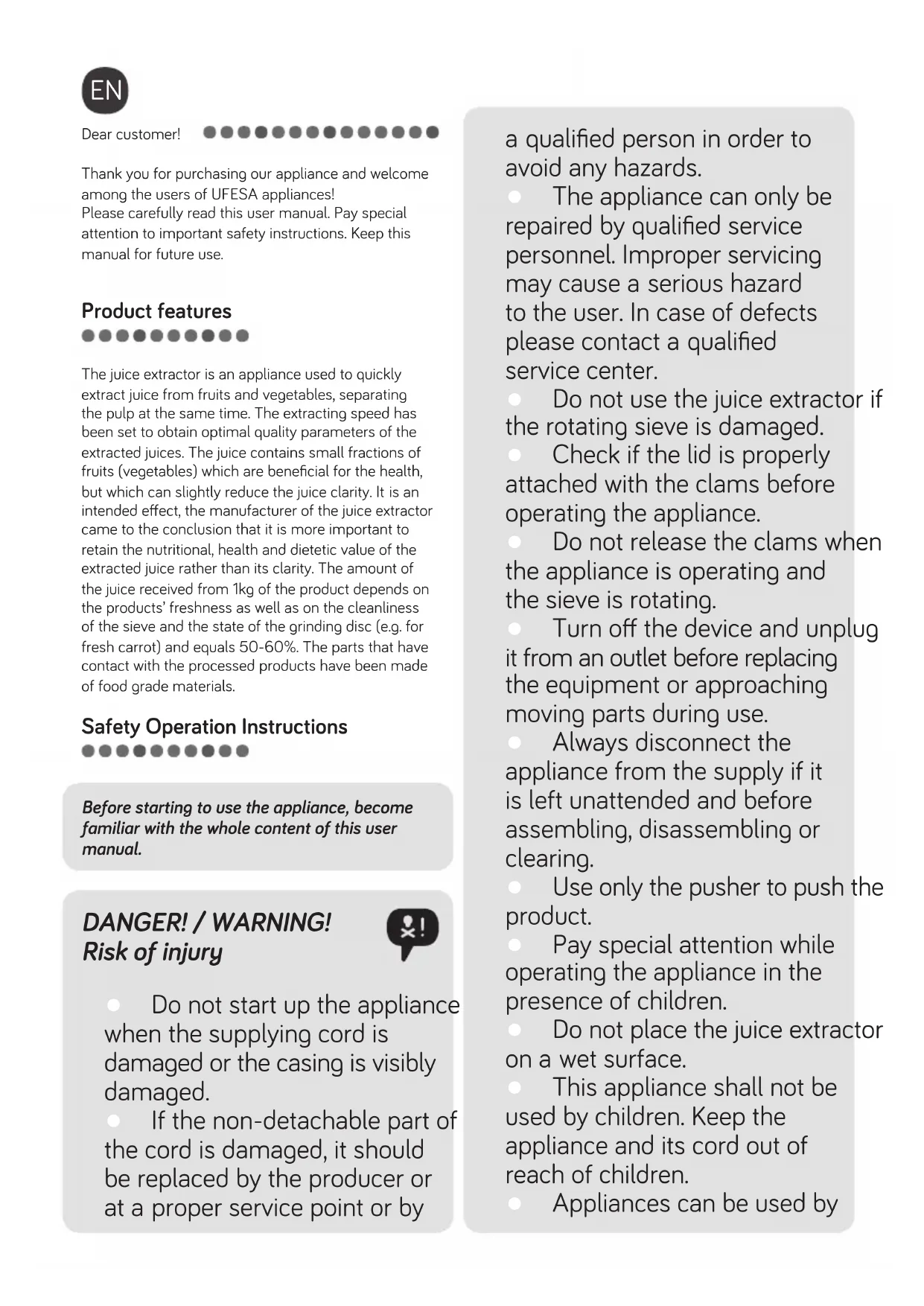 ● This appliance is intended for domestic use only. Incase it is used for food business purposes, the warranty conditions shall change. ● Unplug the appliance after operation. ● Use a soft brush to wash the metal parts especially the sieve with the sharp grinding disc. ● Do not wash metal parts in the dishwasher. Aggressive detergents used in the dishwasher cause these parts to darken. Wash them manually using traditional dishwashing liquids. ● Before the first use, wash thoroughly all elements of the equipment. ● Do not leave a plugged in appliance unattended. ● Do not immerse the motor into water. Do not wash it under running water. ● Do not use abrasive detergents such as emulsions, cream cleaners, polishes, etc. to clean the housing. They may remove the graphic information symbols such as: scales, marks, warning signs etc. ● Place the motor body near a socket on a flat, stable surface so that the vent holes of the appliance are not covered. persons with reduced physical,