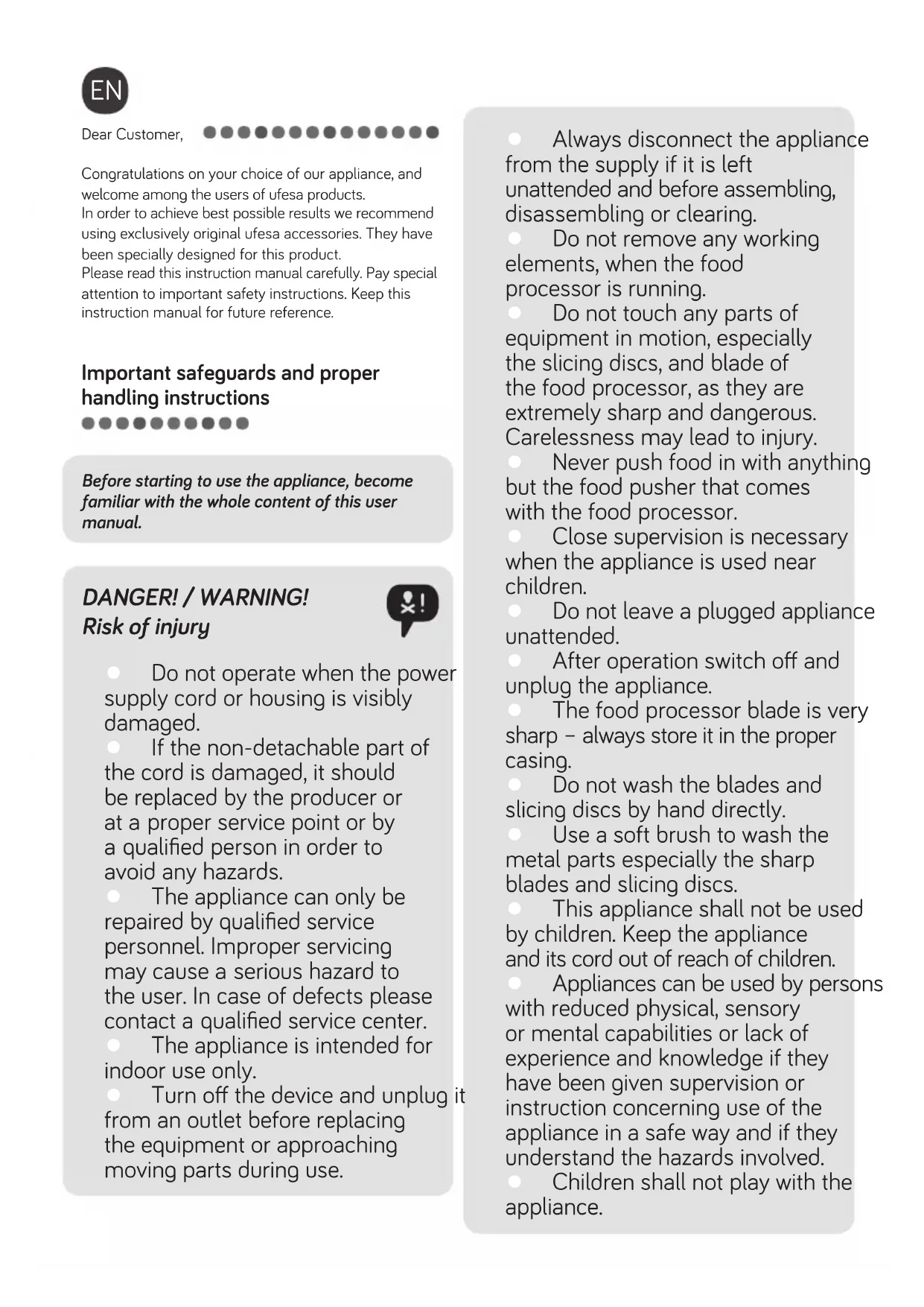 ● Do not unplug the appliance by pulling the cord. ● Always plug the appliance to the mains (AC only) with voltage corresponding to that indicated on the rating plate. ● Before operating, make sure that no hard object (e.g.aspoon) is accidentally placed in the container. ● Before operating check if the chosen speed level does not exceed the permitted speed range for agiven tool. ● To remove food from the container use the spatula that comes with the food processor. ● Do not overload the appliance by putting in too much food or pushing too hard. ● Do not stop the food processor by opening the container’s lid or by turning the container (emergency stop). This procedure should be avoided as it results in the motor wearing out faster. ● Do not expose the appliance to temperatures above 60°C. ● Do not immerse the motor and do not wash it under running water. ● Do not use aggressive detergents such as emulsions, cream cleaners and polishes. Such detergents may remove the graphic symbols from the appliance such as e.g. scales marks and warning signs etc. ● Do not wash the metal parts in the dishwasher. Aggressive detergents used in dishwashers result in darkening of these metal parts. Wash the metal parts manually using a dishwashing liquid. Specifications The technical parameters are indicated on the rating label.Permissible time of non-stop operation and amount of processed food – see appropriate tables.Noise level (L WA ) with food processor: 85 dB/AThe appliance does not require grounding .Ufesa food processor meets the requirements of the existing norms.The appliance is in conformity with the requirements of the directives: – Low voltage device (LVD) – 2006/95/EC. – Electromagnetic compatibility (EMC) – 2004/108/EC.The appliance was marked by the CE sign on the rating label. Appliance description The unit has: ● a safety interlock device which prevents the appliance from operating without the lid or with the lid not properly closed, ● a system which immediately stops the appliance in case of an attempt to open the lid or take out the container during operation, ● rotation speed control, ● PULSE control function which enables to control the grinding level. Appliance elements