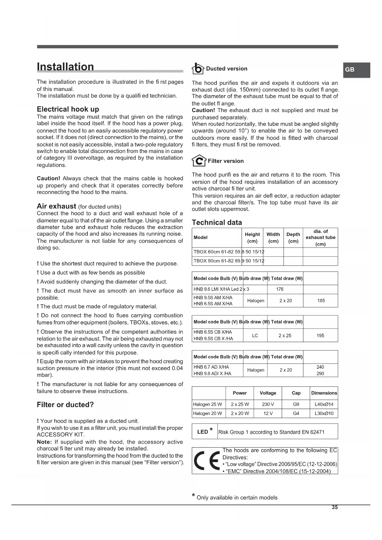 Installation The installation procedure is illustrated in the fi rst pages of this manual. The installation must be done by a qualifi ed technician. Electrical hook up The mains voltage must match that given on the ratings label inside the hood itself. If the hood has a power plug, connect the hood to an easily accessible regulatory power socket. If it does not (direct connection to the mains), or the socket is not easily accessible, install a two-pole regulatory switch to enable total disconnection from the mains in case of category III overvoltage, as required by the installation regulations. Caution! Always check that the mains cable is hooked up properly and check that it operates correctly before reconnecting the hood to the mains. Air exhaust (for ducted units) Connect the hood to a duct and wall exhaust hole of a diameter equal to that of the air outlet fl ange. Using a smaller diameter tube and exhaust hole reduces the extraction capacity of the hood and also increases its running noise. The manufacturer is not liable for any consequences of doing so. ! Use the shortest duct required to achieve the purpose. ! Use a duct with as few bends as possible ! Avoid suddenly changing the diameter of the duct. ! The duct must have as smooth an inner surface as possible. ! The duct must be made of regulatory material. ! Do not connect the hood to fl ues carrying combustion fumes from other equipment (boilers, TBOXs, stoves, etc.). ! Observe the instructions of the competent authorities in relation to the air exhaust. The air being exhausted may not be exhausted into a wall cavity unless the cavity in question is specifi cally intended for this purpose. ! Equip the room with air intakes to prevent the hood creating suction pressure in the interior (this must not exceed 0.04 mbar). ! The manufacturer is not liable for any consequences of failure to observe these instructions. Filter or ducted? ! Your hood is supplied as a ducted unit. If you wish to use it as a fi lter unit, you must install the proper ACCESSORY KIT. Note: If supplied with the hood, the accessory active charcoal fi lter unit may already be installed. Instructions for transforming the hood from the ducted to the fi lter version are given in this manual (see “Filter version”). Ducted version The hood purifi es the air and expels it outdoors via an exhaust duct (dia. 150mm) connected to its outlet fl ange. The diameter of the exhaust tube must be equal to that of the outlet fl ange. Caution! The exhaust duct is not supplied and must be purchased separately. When routed horizontally, the tube must be angled slightly upwards (around 10°) to enable the air to be conveyed outdoors more easily. If the hood is fi tted with charcoal fi lters, they must fi rst be removed. Filter version The hood purifi es the air and returns it to the room. This version of the hood requires installation of an accessory active charcoal fi lter unit. This version requires an air defl ector, a reduction adapter and the charcoal fi lter/s. The top tube must have its air outlet slots uppermost. Technical data ModelHeight (cm) Width (cm) Depth (cm) dia. of exhaust tube (cm) TBOX 60cm 61-82 59.8 50 15/12TBOX 90cm 61-82 89.9 50 15/12Model code Bulb (V) Bulb draw (W) Total draw (W)HNB 9.6 LMI X/HA Led 2 x 3 176HNB 9.5S AM X/HAHNB 6.5S AM X/HAHalogen 2 x 20 185Model code Bulb (V) Bulb draw (W) Total draw (W)HNB 6.5S CB X/HAHNB 9.5S CB X /HALC 2 x 25 195Model code Bulb (V) Bulb draw (W) Total draw (W)HNB 6.7 AD X/HAHNB 9.8 ADI X /HAHalogen 2 x 20