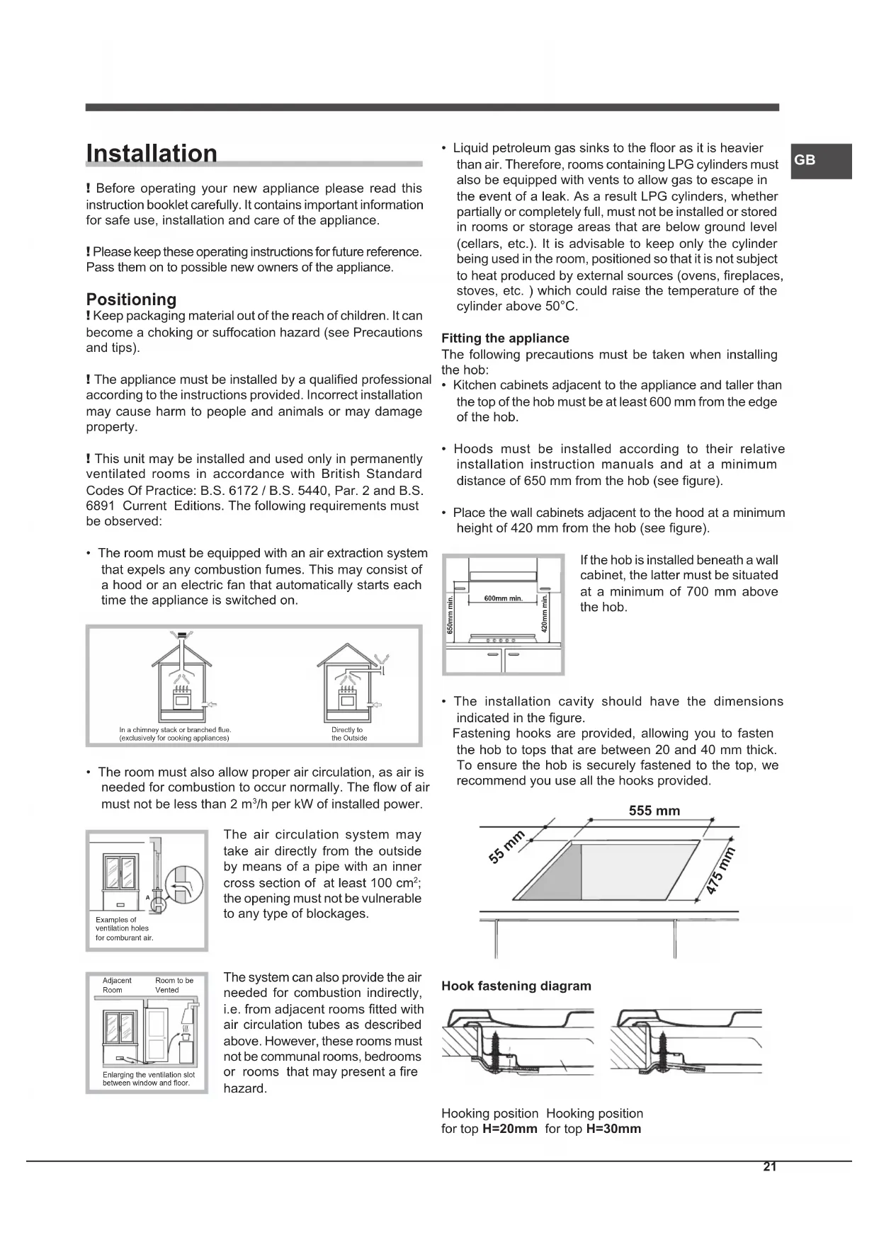 Installation ! Before operating your new appliance please read this instruction booklet carefully. It contains important information for safe use, installation and care of the appliance. ! Please keep these operating instructions for future reference. Pass them on to possible new owners of the appliance. Positioning ! Keep packaging material out of the reach of children. It can become a choking or suffocation hazard (see Precautions and tips). ! The appliance must be installed by a qualied professional according to the instructions provided. Incorrect installation may cause harm to people and animals or may damage property. ! This unit may be installed and used only in permanently ventilated rooms in accordance with British Standard Codes Of Practice: B.S. 6172 / B.S. 5440, Par. 2 and B.S. 6891 Current Editions. The following requirements must be observed: