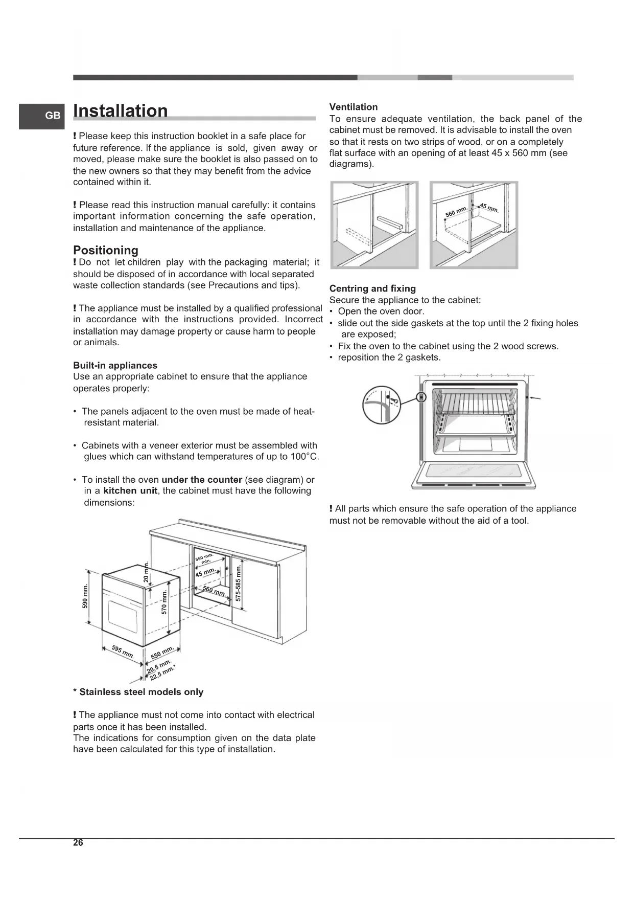 - Stainless steel models only ! The appliance must not come into contact with electrical parts once it has been installed. The indications for consumption given on the data plate have been calculated for this type of installation. Ventilation To ensure adequate ventilation, the back panel of the cabinet must be removed. It is advisable to install the oven so that it rests on two strips of wood, or on a completely at surface with an opening of at least 45 x 560 mm (see diagrams). 560 mm. 45 mm. Centring and xing Secure the appliance to the cabinet: