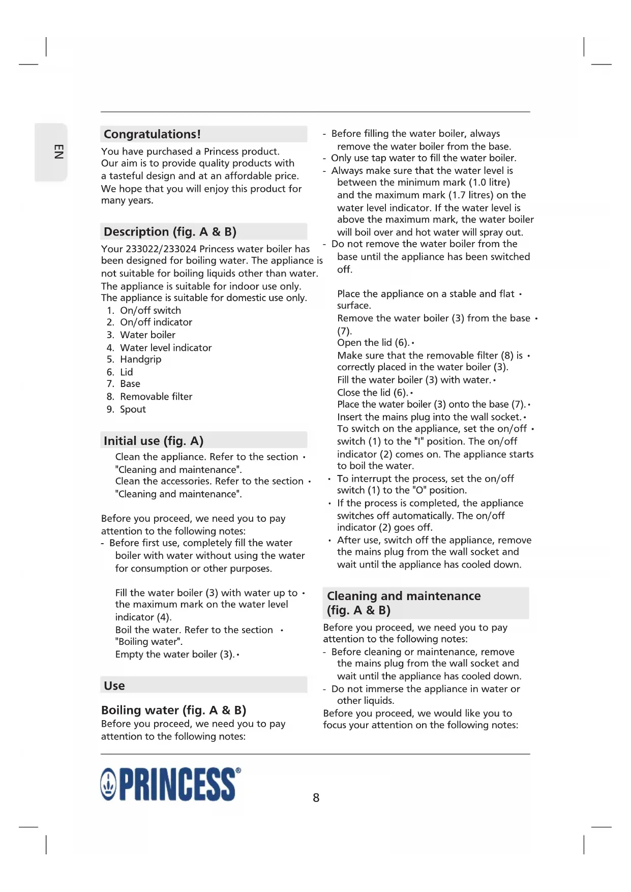 Your 233022/233024 Princess water boiler has