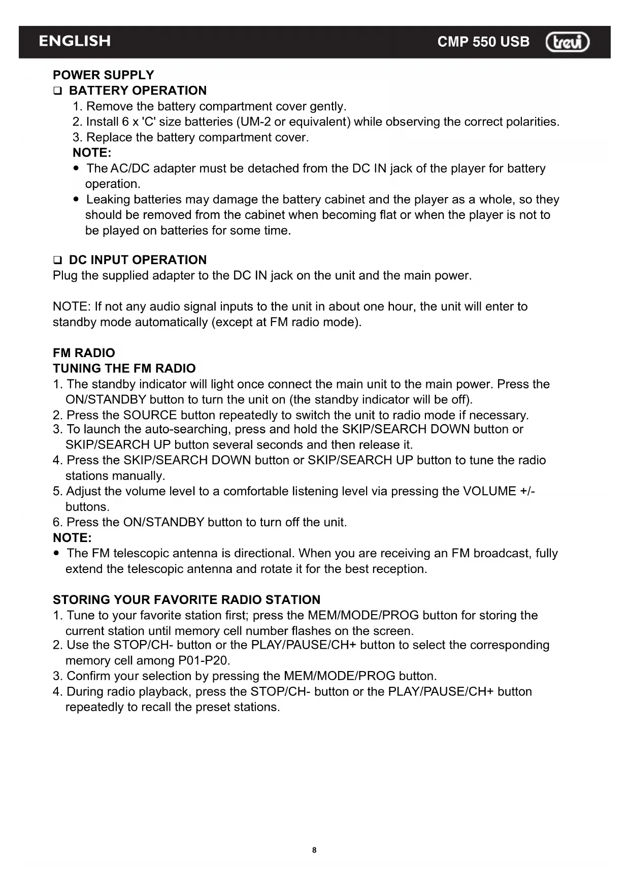 For cleaning, we recommend using a soft, damp cloth. Avoid solvents and abrasives. IMPORTANT Any MP3 player is not working properly, this is due to the incompatibility for the processor. Good manufacturing this device ensures long perfect operation. If still any problem occurs, it will be appropriate to consult the authorized Service Centre. When the AC/DC adapter is used as the disconnect device, the disconnect device shall remain readily operable. To be completely disconnected the power input, the AC/DC adapter shall be disconnected from the mains completely. The marking plate is located at the bottom of the apparatus. TREVIfollowsapolicyofcontinuousresearchanddevelopment.Thereforeproductsmayhavedifferentcharacteristicstothosedescribed.7 CMP 550 USB ENGLISH