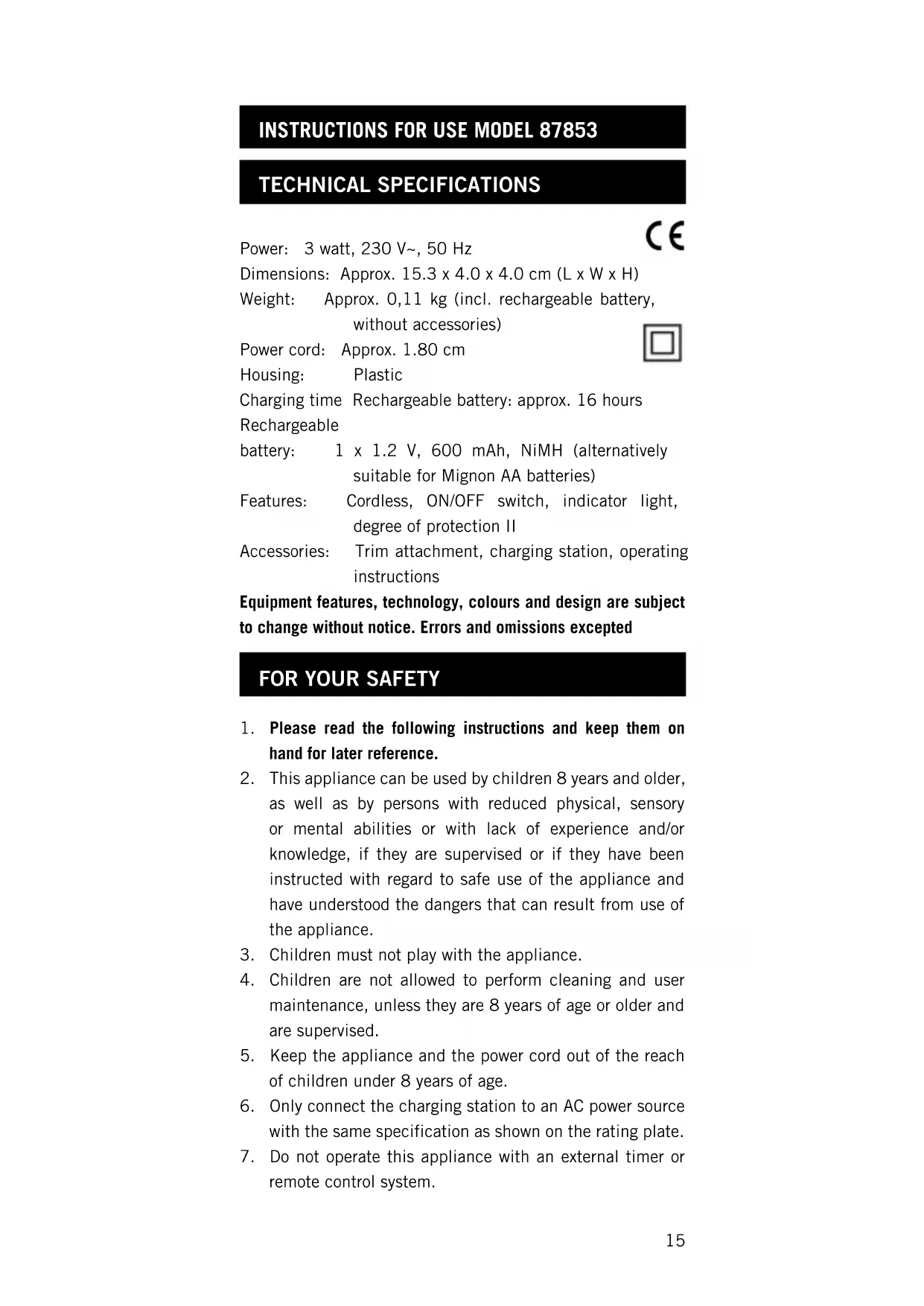 INSTRUCTIONS FOR USE MODEL 87853