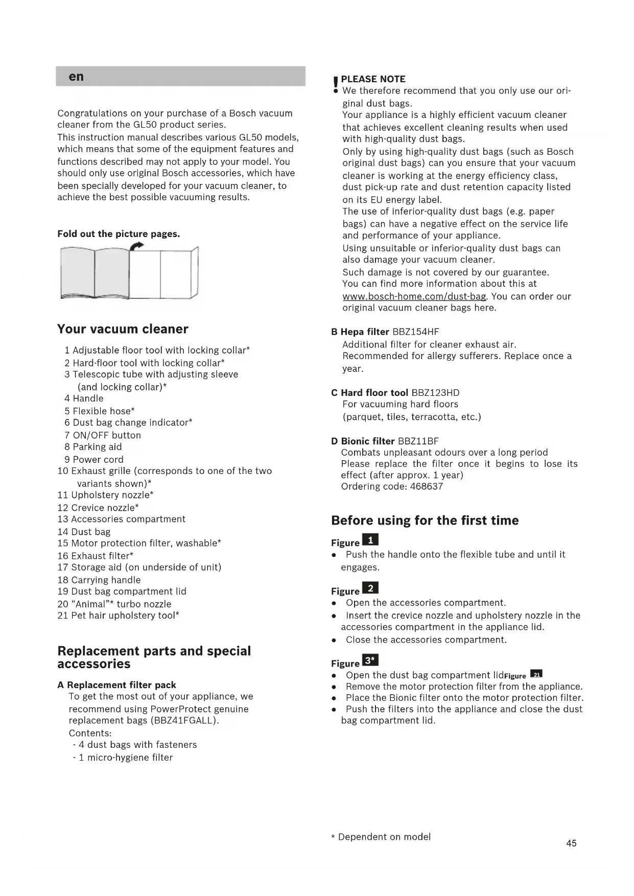 Spare parts, accessories, dust bags
