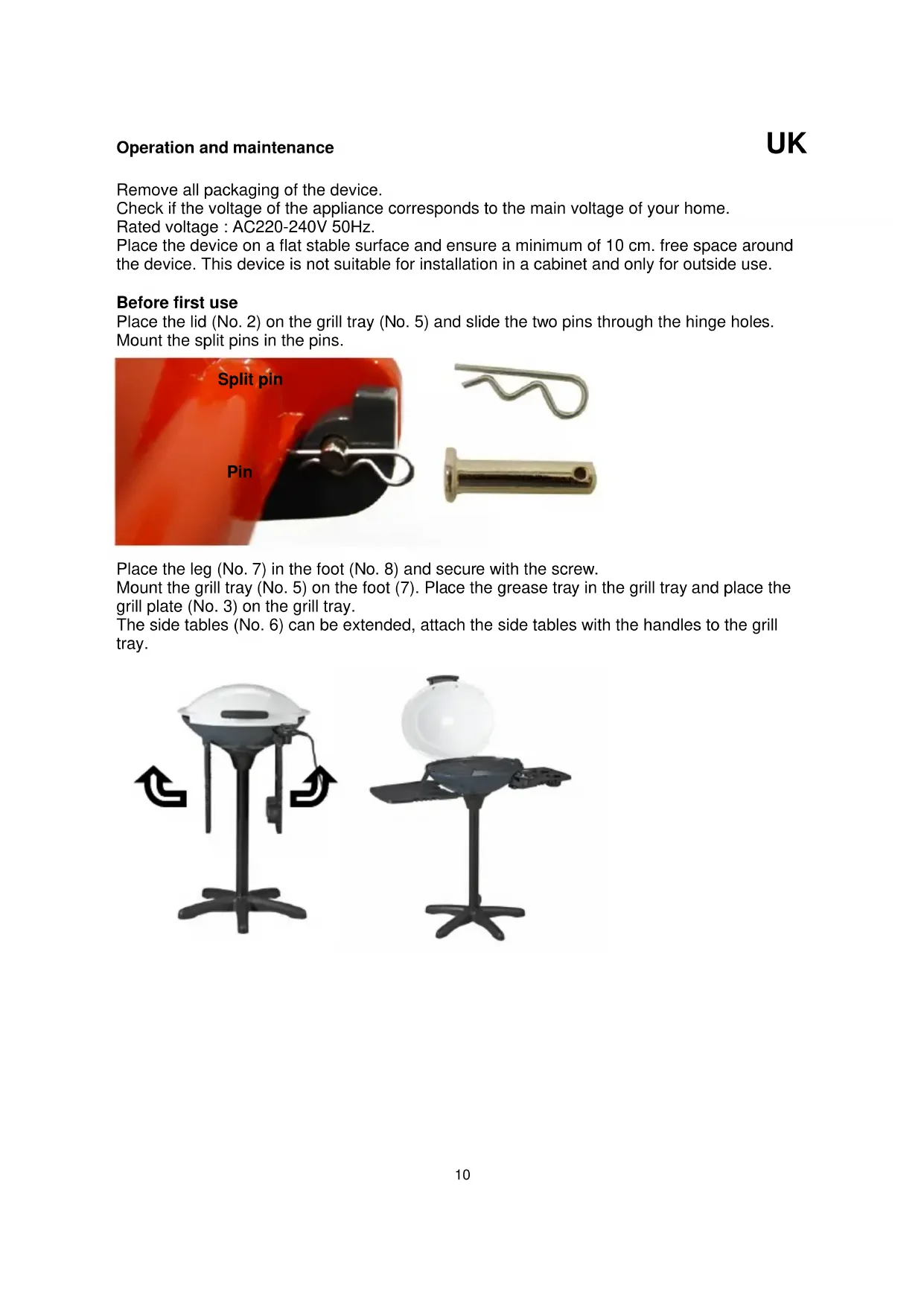 Place the lid (No. 2) on the grill tray (No. 5) and slide the two pins through the hinge holes. Mount the split pins in the pins.