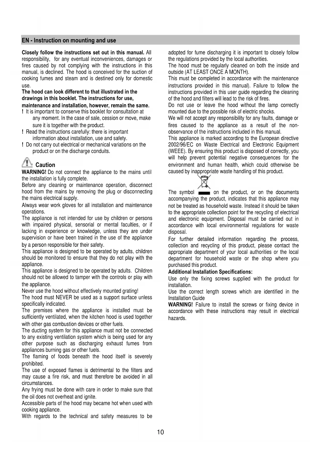 WARNING! Do not connect the appliance to the mains until