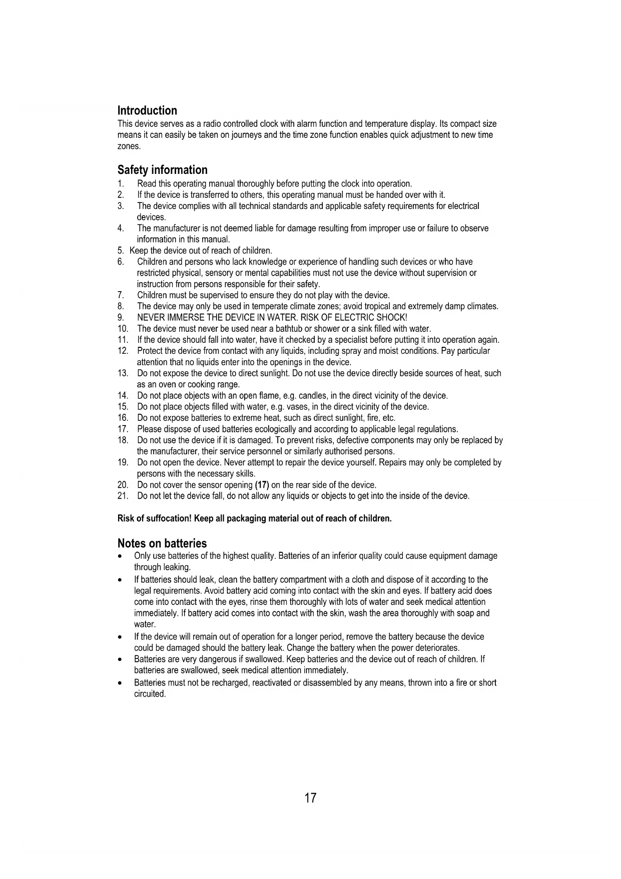 In order to dispose of your device, take it to a collection point provided by your local public waste authorities (e.g. recycling centre). According to laws on the disposal of electronic and electrical devices, owners are obliged to dispose of old electronic and electrical devices in a separate waste container. The adjacent symbol indicates that the device must not be disposed of in normal domestic waste! Risks to health and the environment from batteries! Never open, damage or swallow batteries or allow them to pollute the environment. They could contain toxic and ecologically harmful heavy metals. You are legally obliged to dispose of power packs and batteries at the point of sale or in the corresponding containers provided at collection points by local public waste authorities. Disposal is free of charge. The above symbols indicate that the batteries must not be disposed of in domestic waste and that they must be disposed of at an authorised collection point.