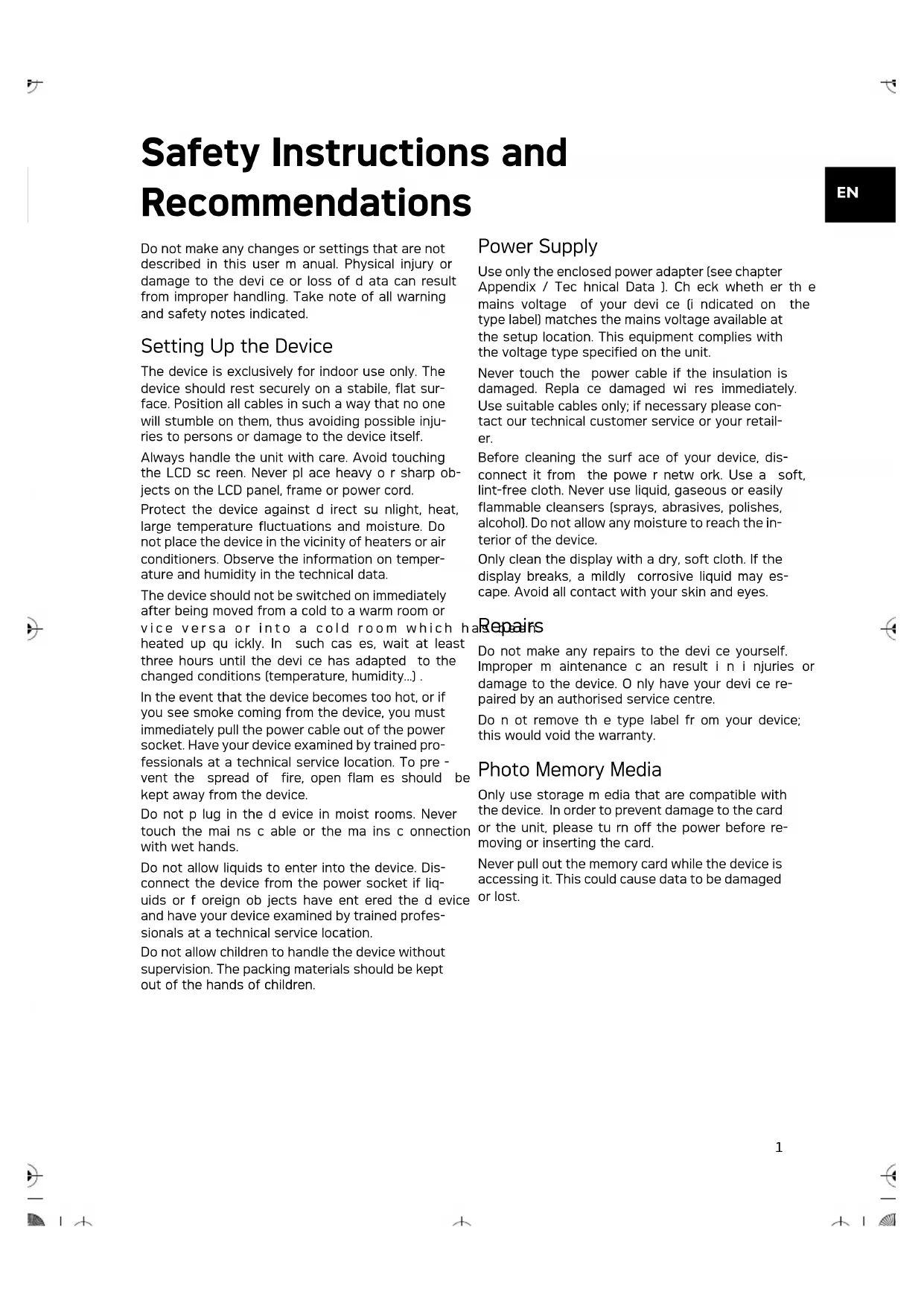 The device is exclusively for indoor use only. The device should rest securely on a stable, flat surface. Position all cables in such a way that no one will stumble on them, thus avoiding possible injuries to persons or damage to the device itself.