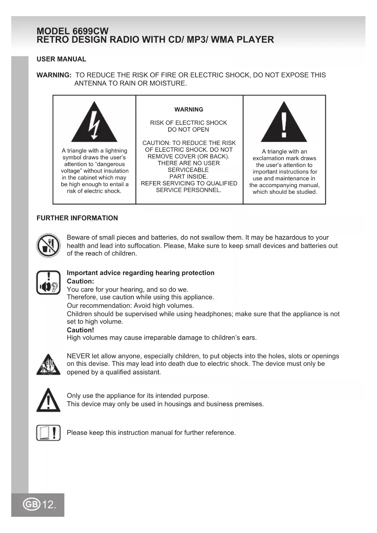 NEVER let allow anyone, especially children, to put objects into the holes, slots or openings on this devise. This may lead into death due to electric shock. The device must only be opened by a qualified assistant.