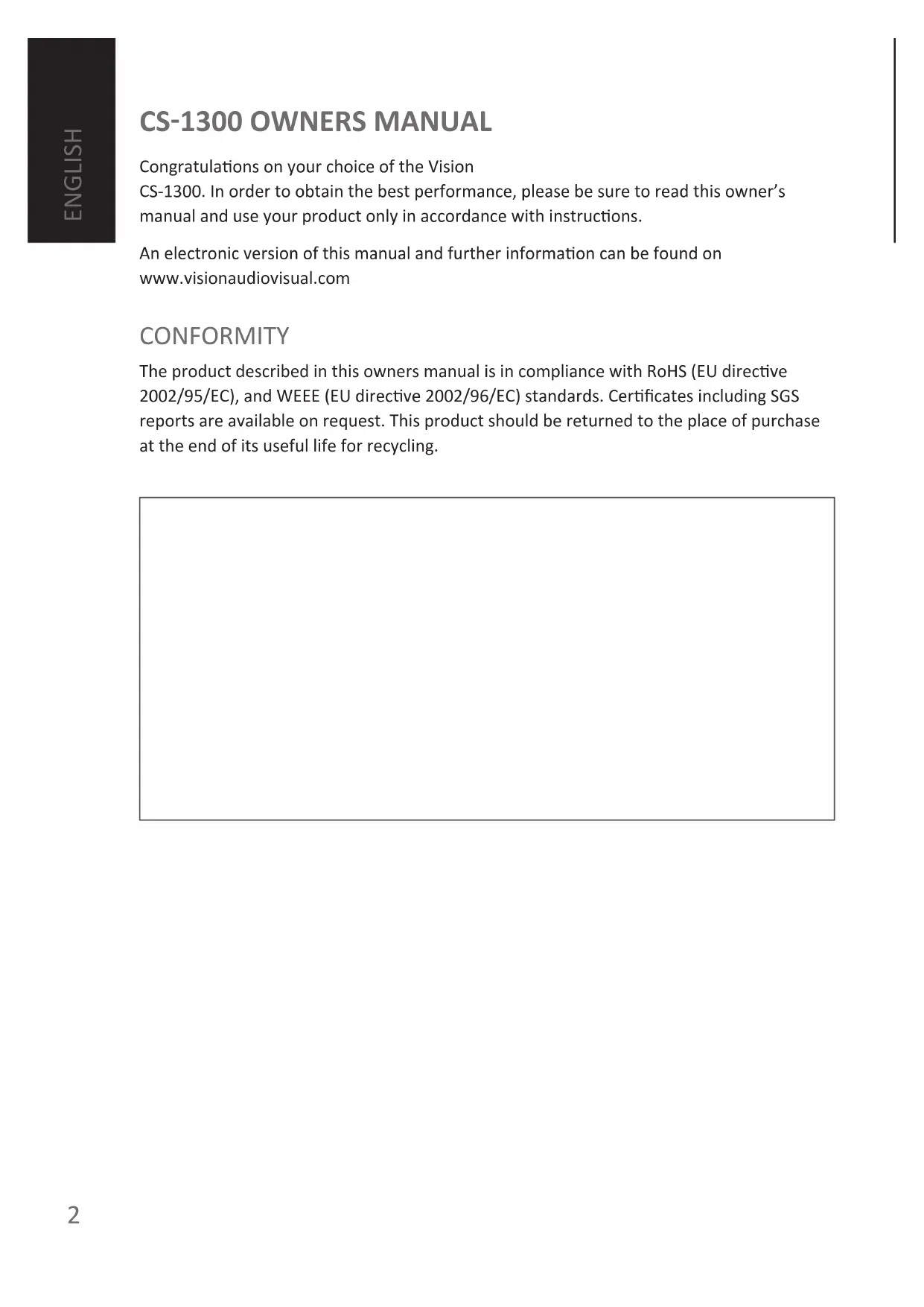 ENGLISH CS-1300 OWNERS MANUAL Congratulaons on your choice of the Vision