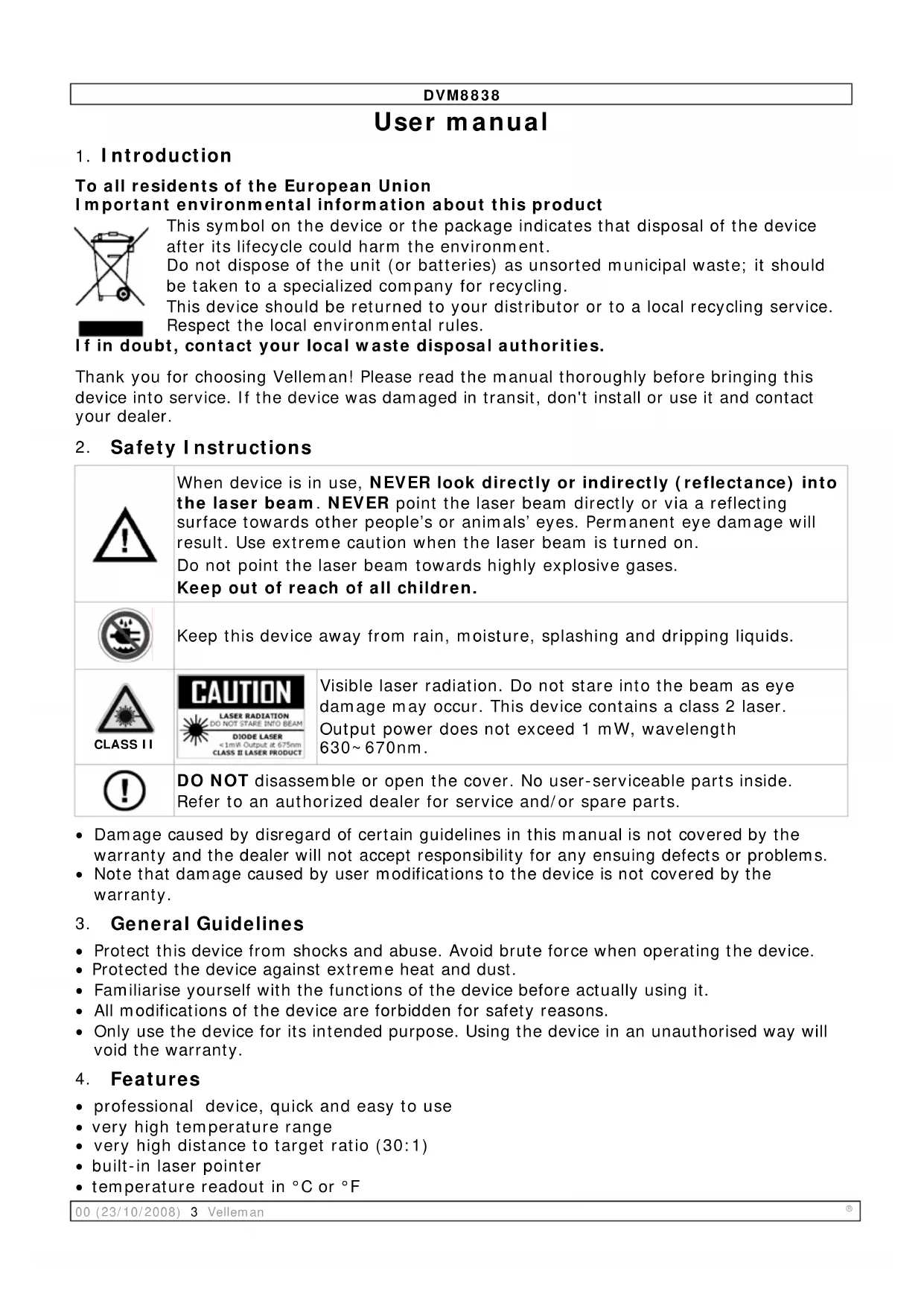 Download the instructions for your Thermometer in PDF format for free! Find your manual DVM8838 - VELLEMAN and take your electronic device back in hand. On this page are published all the documents necessary for the use of your device. DVM8838 by VELLEMAN.