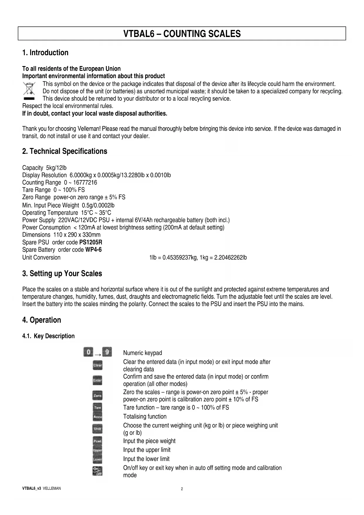 Download the instructions for your Scale in PDF format for free! Find your manual VTBAL6 - VELLEMAN and take your electronic device back in hand. On this page are published all the documents necessary for the use of your device. VTBAL6 by VELLEMAN.