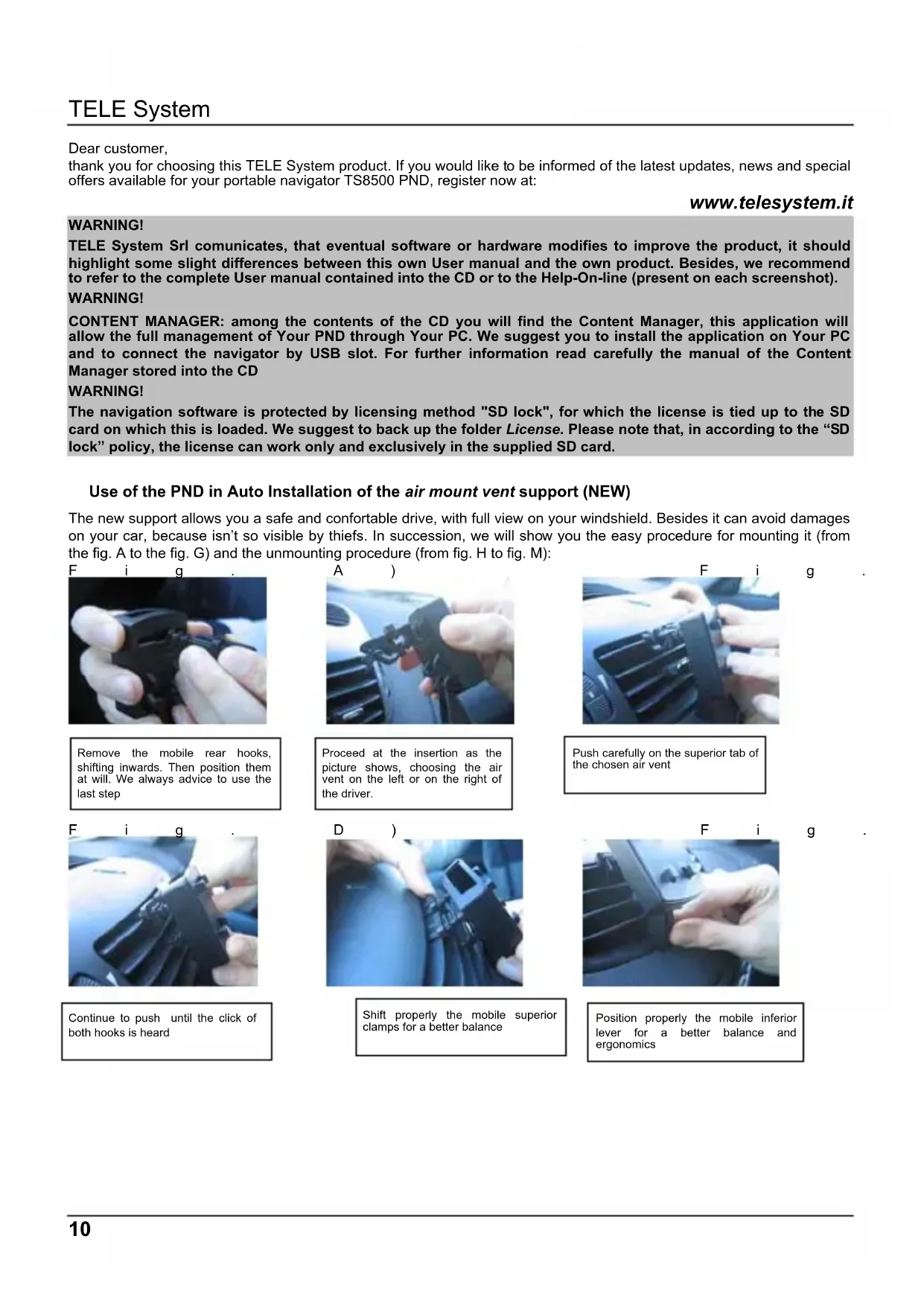 - TELESystem doesn't answer to any damages in any vehicle coming from installation or uninstallation of the car support.