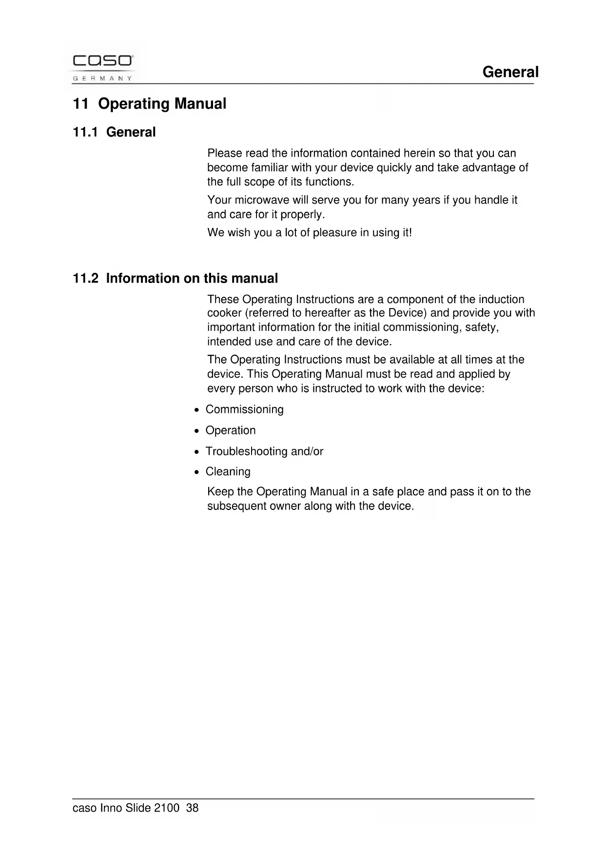 These Operating Instructions are a component of the induction cooker (referred to hereafter as the Device) and provide you with important information for the initial commissioning, safety, intended use and care of the device. The Operating Instructions must be available at all times at the device. This Operating Manual must be read and applied by every person who is instructed to work with the device: Commissioning Operation Troubleshooting and/or Cleaning Keep the Operating Manual in a safe place and pass it on to the subsequent owner along with the device.General caso Inno Slide 2100 39