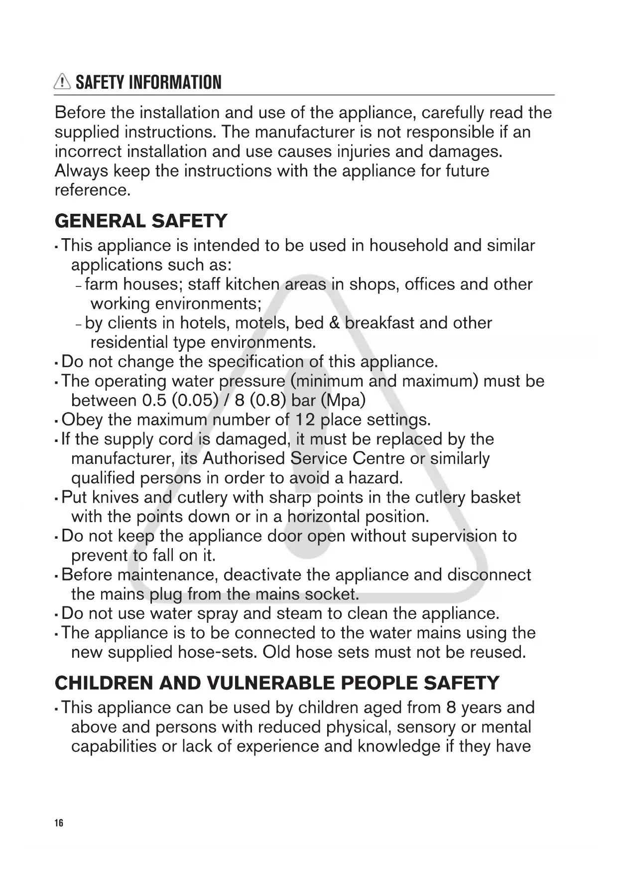 15SAFETY INFORMATION Before the installation and use of the appliance, carefully read the