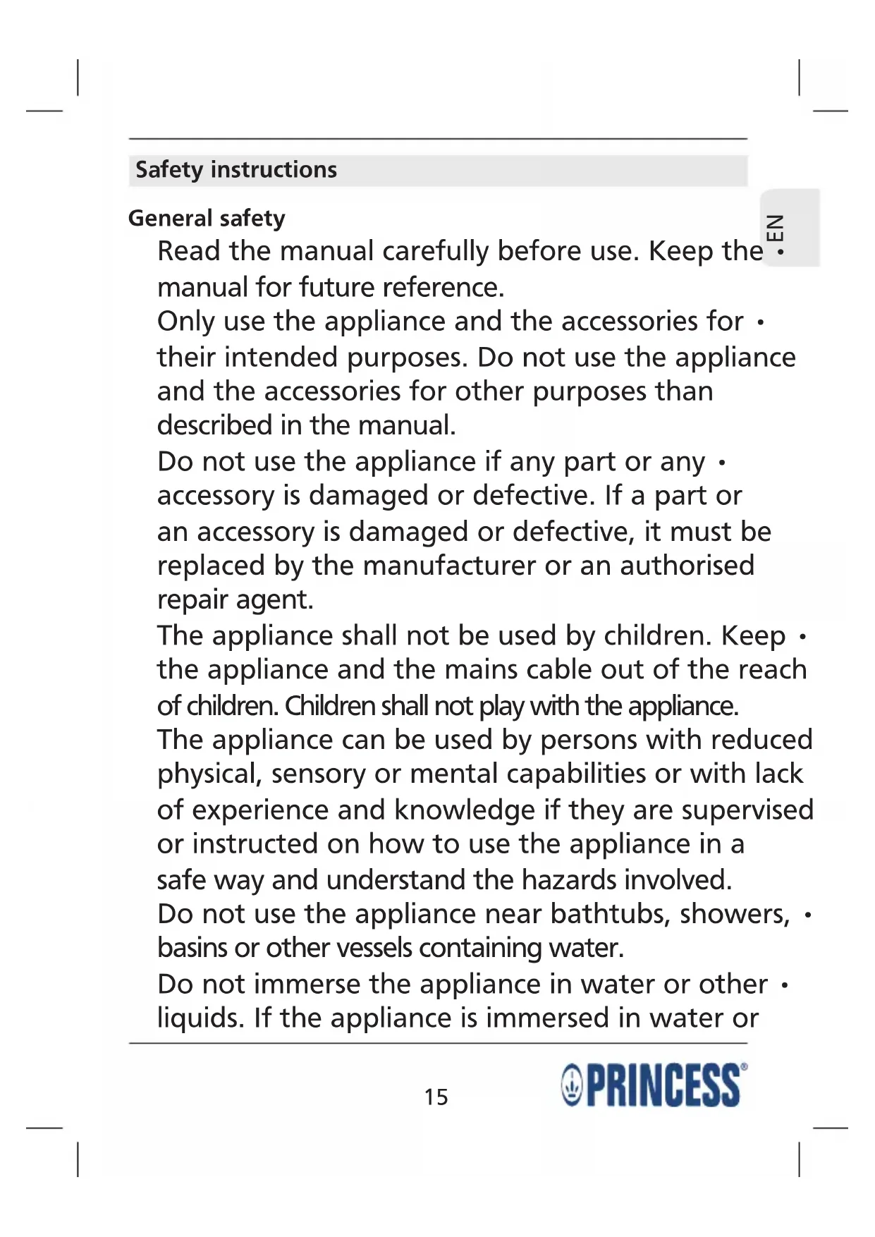 - Do not immerse the appliance in water or other liquids.