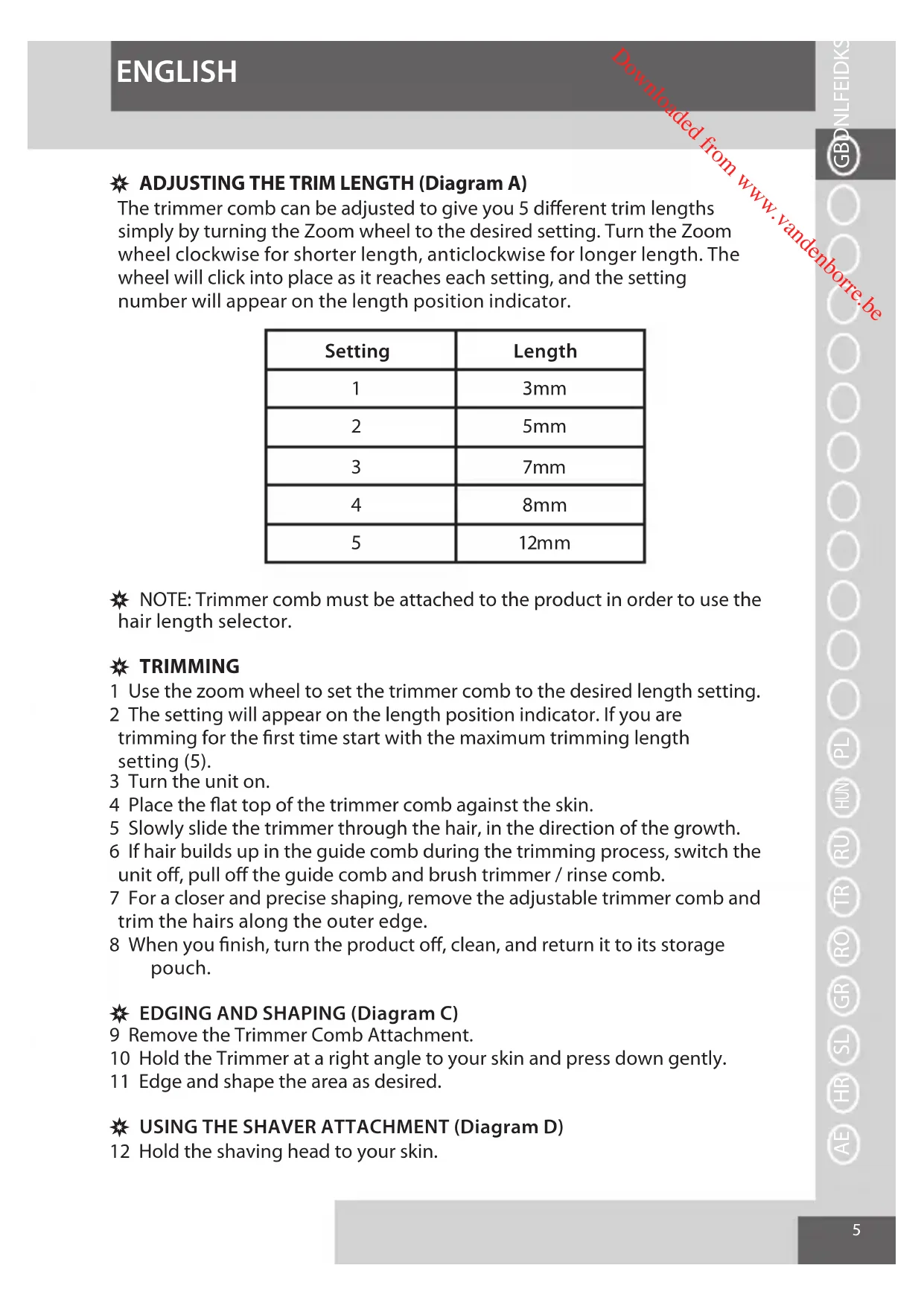 The trimmer comb can be adjusted to give you 5 dierent trim lengths