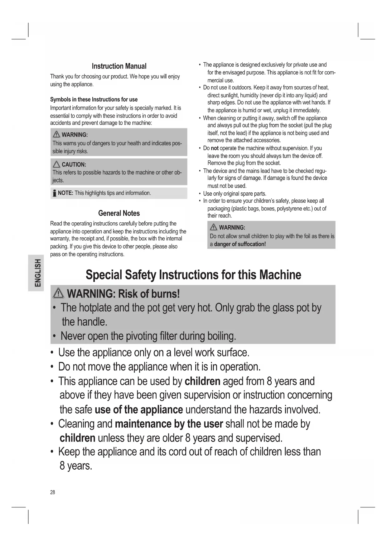 Do not allow small children to play with the foil as there is a danger of suffocation! Instruction Manual Thank you for choosing our product. We hope you will enjoy using the appliance. Symbols in these Instructions for use Important information for your safety is specially marked. It is essential to comply with these instructions in order to avoid accidents and prevent damage to the machine: