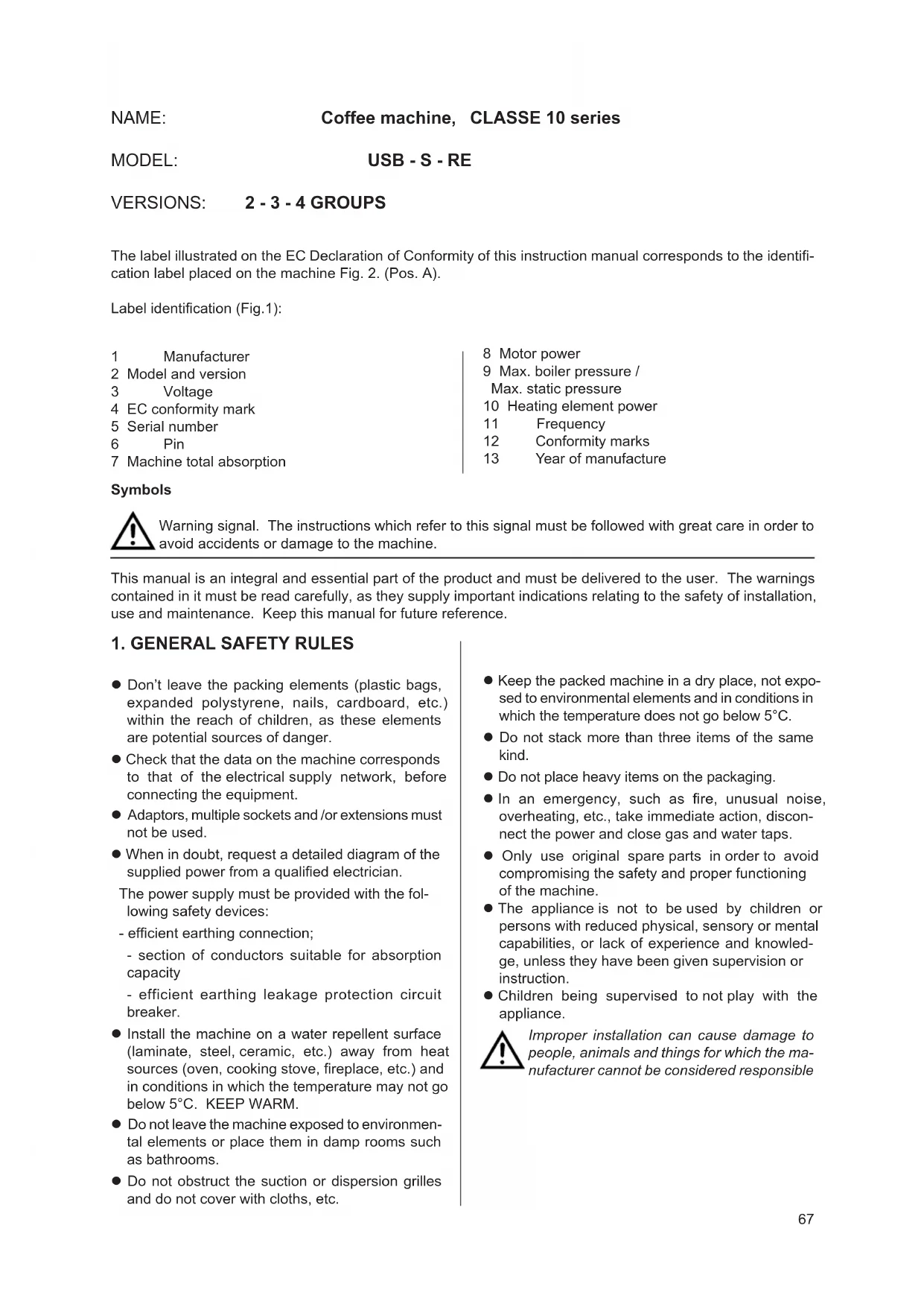 The label illustrated on the EC Declaration of Conformity of this instruction manual corresponds to the identi- cation label placed on the machine Fig. 2. (Pos. A). Label identication (Fig.1): Keep the packed machine in a dry place, not expo- sed to environmental elements and in conditions in which the temperature does not go below 5°C. Do not stack more than three items of the same kind. Do not place heavy items on the packaging. In an emergency, such as re, unusual noise, overheating, etc., take immediate action, discon- nect the power and close gas and water taps. Only use original spare parts in order to avoid compromising the safety and proper functioning of the machine. The appliance is not to be used by children or persons with reduced physical, sensory or mental capabilities, or lack of experience and knowled- ge, unless they have been given supervision or instruction. Children being supervised to not play with the appliance. Improper installation can cause damage to people, animals and things for which the ma- nufacturer cannot be considered responsible Symbols Warning signal. The instructions which refer to this signal must be followed with great care in order to avoid accidents or damage to the machine. This manual is an integral and essential part of the product and must be delivered to the user. The warnings contained in it must be read carefully, as they supply important indications relating to the safety of installation, use and maintenance. Keep this manual for future reference.