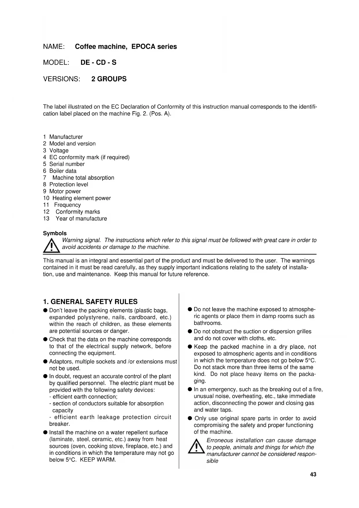 VERSIONS: 2 GROUPS The label illustrated on the EC Declaration of Conformity of this instruction manual corresponds to the identifi- cation label placed on the machine Fig. 2. (Pos. A). Symbols Warning signal. The instructions which refer to this signal must be followed with great care in order to avoid accidents or damage to the machine. This manual is an integral and essential part of the product and must be delivered to the user. The warnings contained in it must be read carefully, as they supply important indications relating to the safety of installa- tion, use and maintenance. Keep this manual for future reference. 1 Manufacturer 2 Model and version 3 Voltage 4 EC conformity mark (if required) 5 Serial number 6 Boiler data 7 Machine total absorption 8 Protection level 9 Motor power 10 Heating element power 11 Frequency 12 Conformity marks 13 Year of manufacture