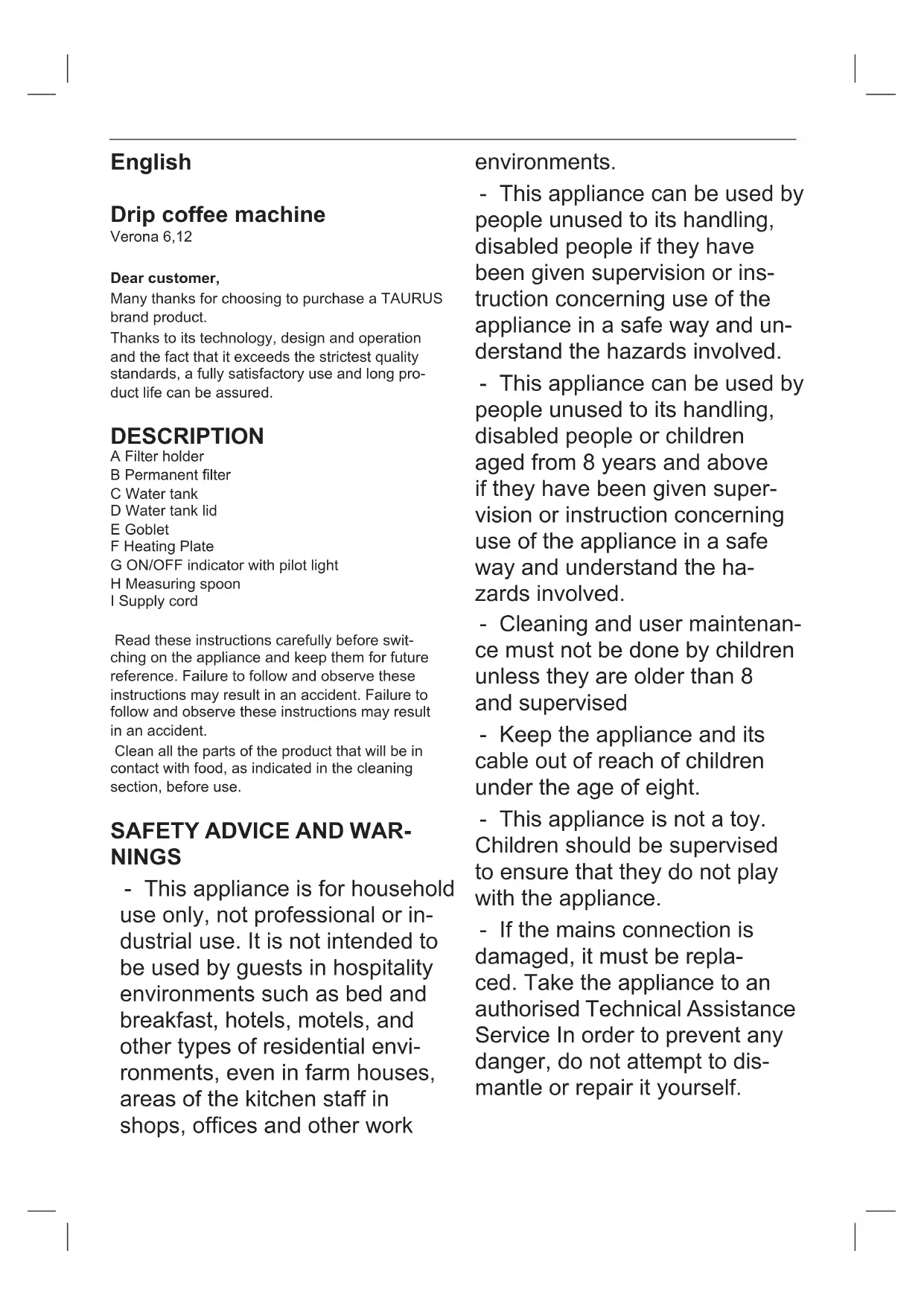 Download the instructions for your Machine à café in PDF format for free! Find your manual Verona 12 - TAURUS and take your electronic device back in hand. On this page are published all the documents necessary for the use of your device. Verona 12 by TAURUS.