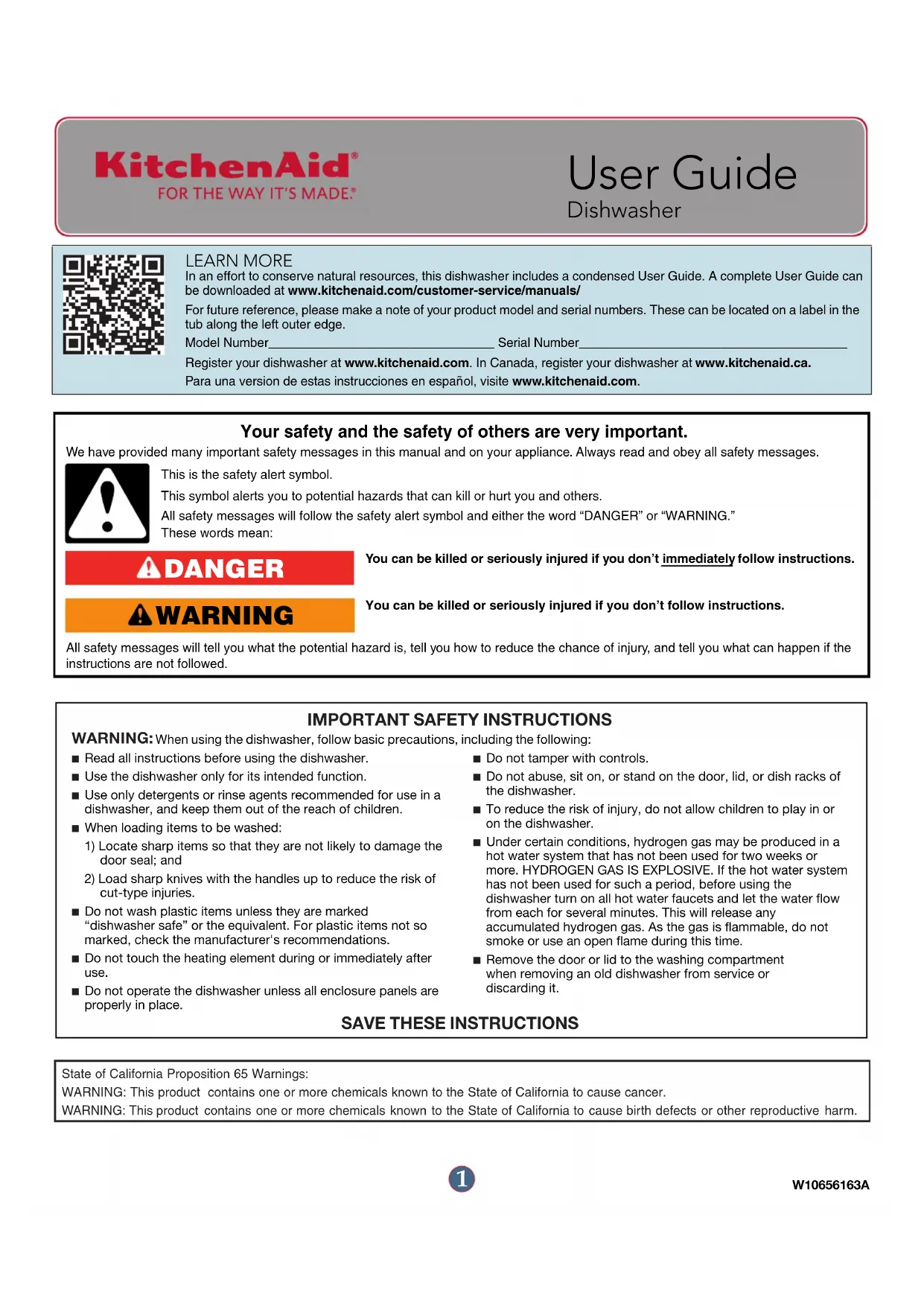 W10656163ALEARN MOREIn an effort to conserve natural resources, this dishwasher includes a condensed User Guide. A complete User Guide can be downloaded at www.kitchenaid.com/customer-service/manuals/ For future reference, please make a note of your product model and serial numbers. These can be located on a label in the tub along the left outer edge. Model Number________________________________ Serial Number______________________________________ Register your dishwasher at www.kitchenaid.com. In Canada, register your dishwasher at www.kitchenaid.ca.