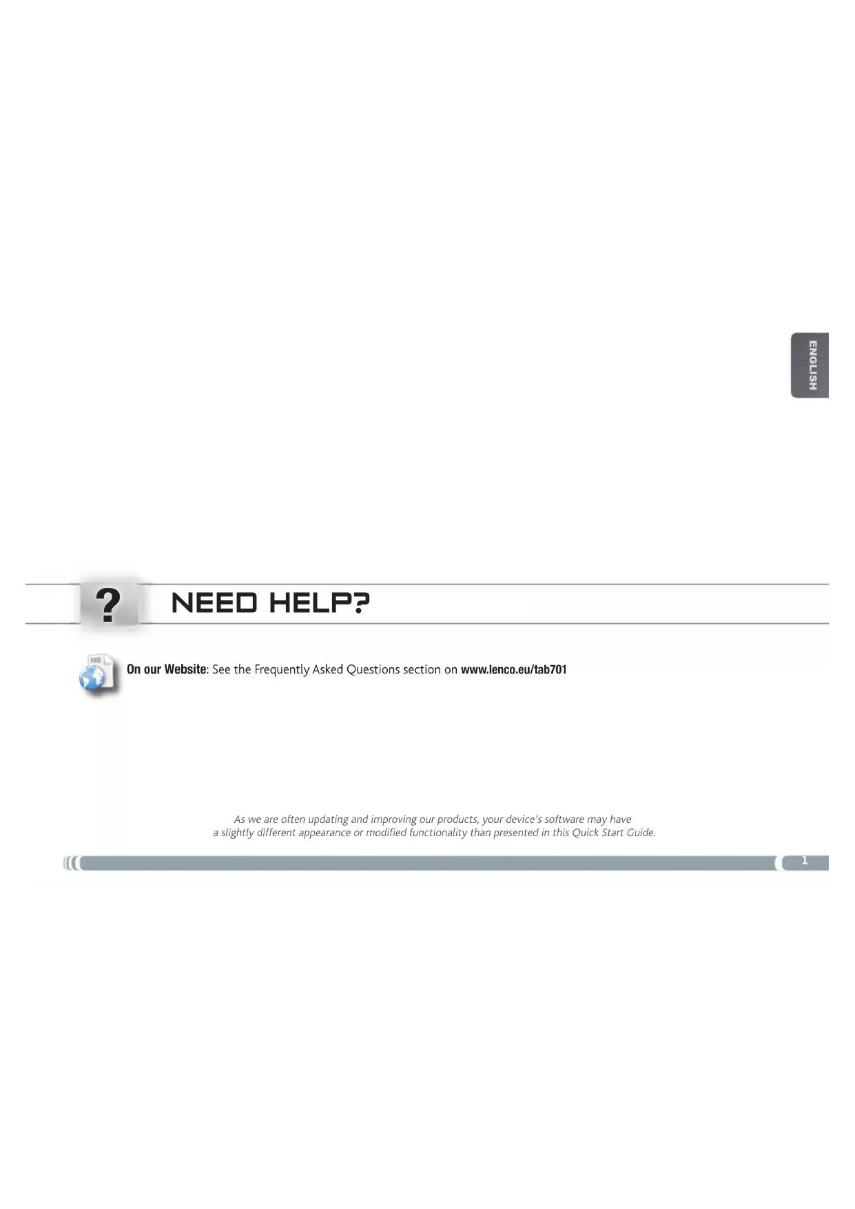 ENGLISH NEED HELP? As we are often updating and improving our products, your device’s software may have a slightly different appearance or modified functionality than presented in this Quick Start Guide. On our Website: See the Frequently Asked Questions section on www.lenco.eu/tab7012