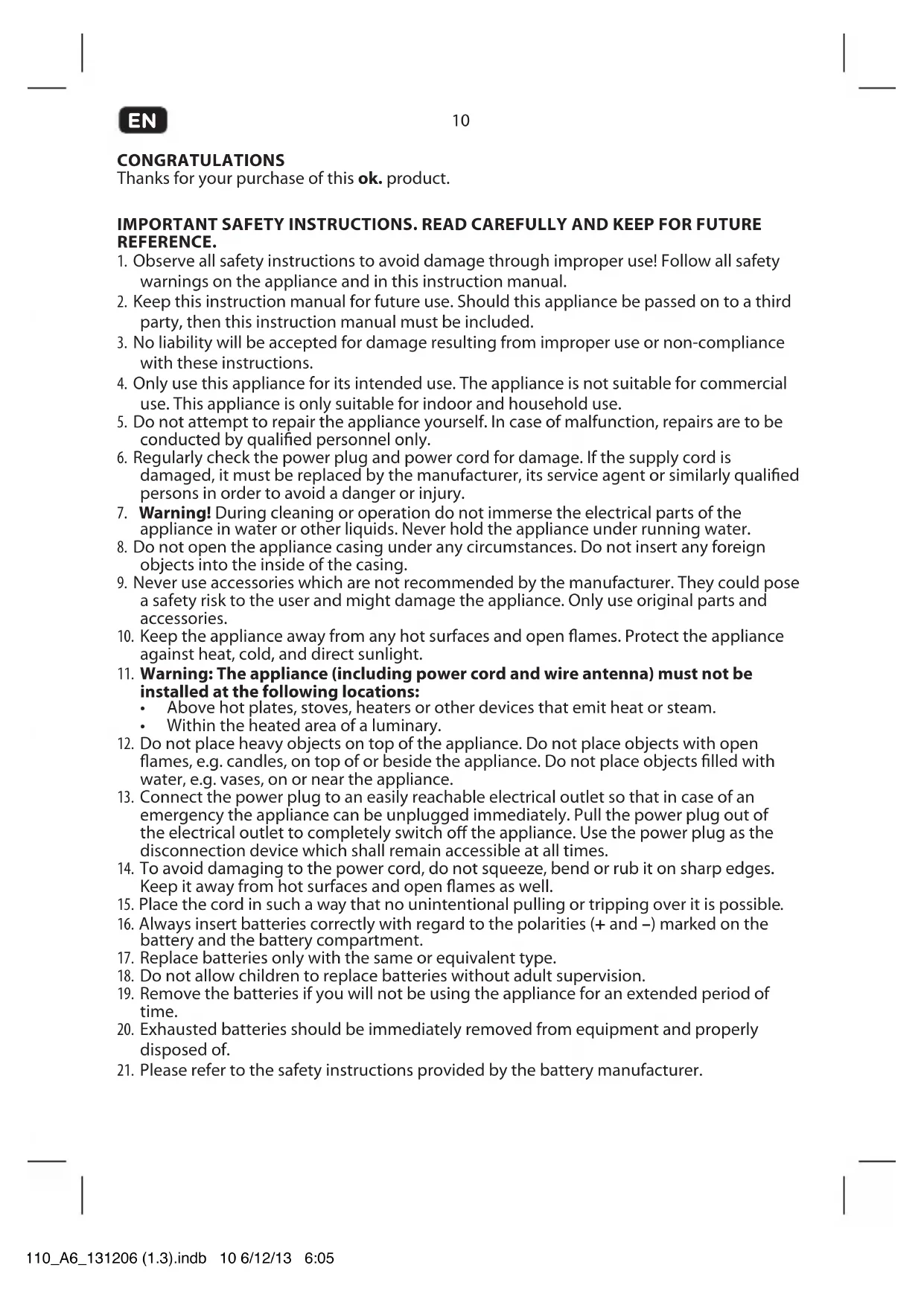 - Only use this appliance for its intended use. The appliance is not suitable for commercial use. This appliance is only suitable for indoor and household use.