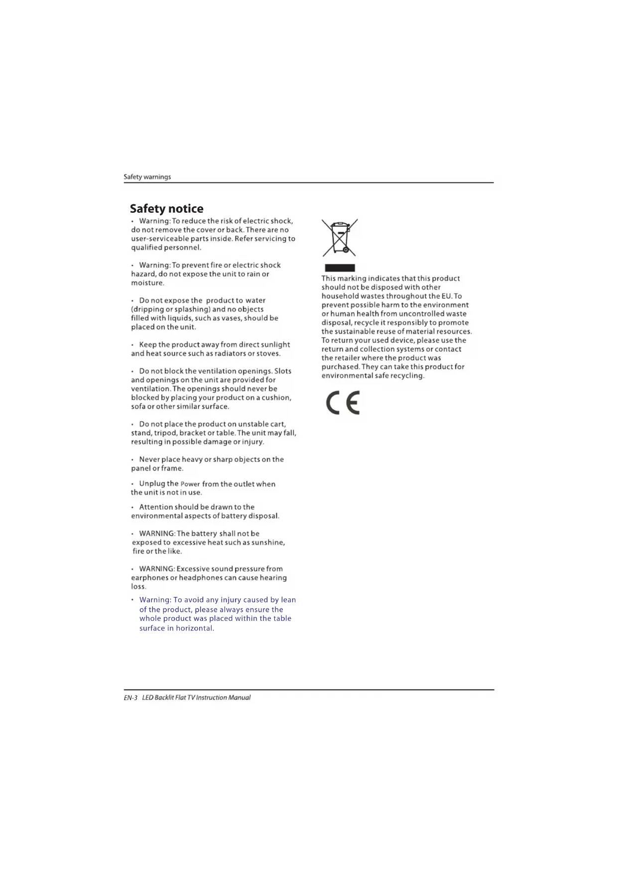 4 NICAM; 5 T ;ime-shift3 HDMI interface and SCART Interface;High luminance, wide viewing angle;2 Used as Television, display terminal, PC display;1 Never tamper with any components inside the TV, or any other adjustment controls not described in this manual. All LED-TV's are high voltage electrical equipment. When you clean dust or any water drops off the SCREEN or CABINET or around any of the buttons or connectors, the power cabled should be removed from the power socket. Wipe the TV with a soft, dry, dust free cloth. During thunderstorms, unplug the power cable and aerial / antenna cable to prevent damage to your TV and any other devices connected to it. All repairs to this TV should only be performed by qualified TV servicepersonnel. 02 Introdution Introduction EN-5