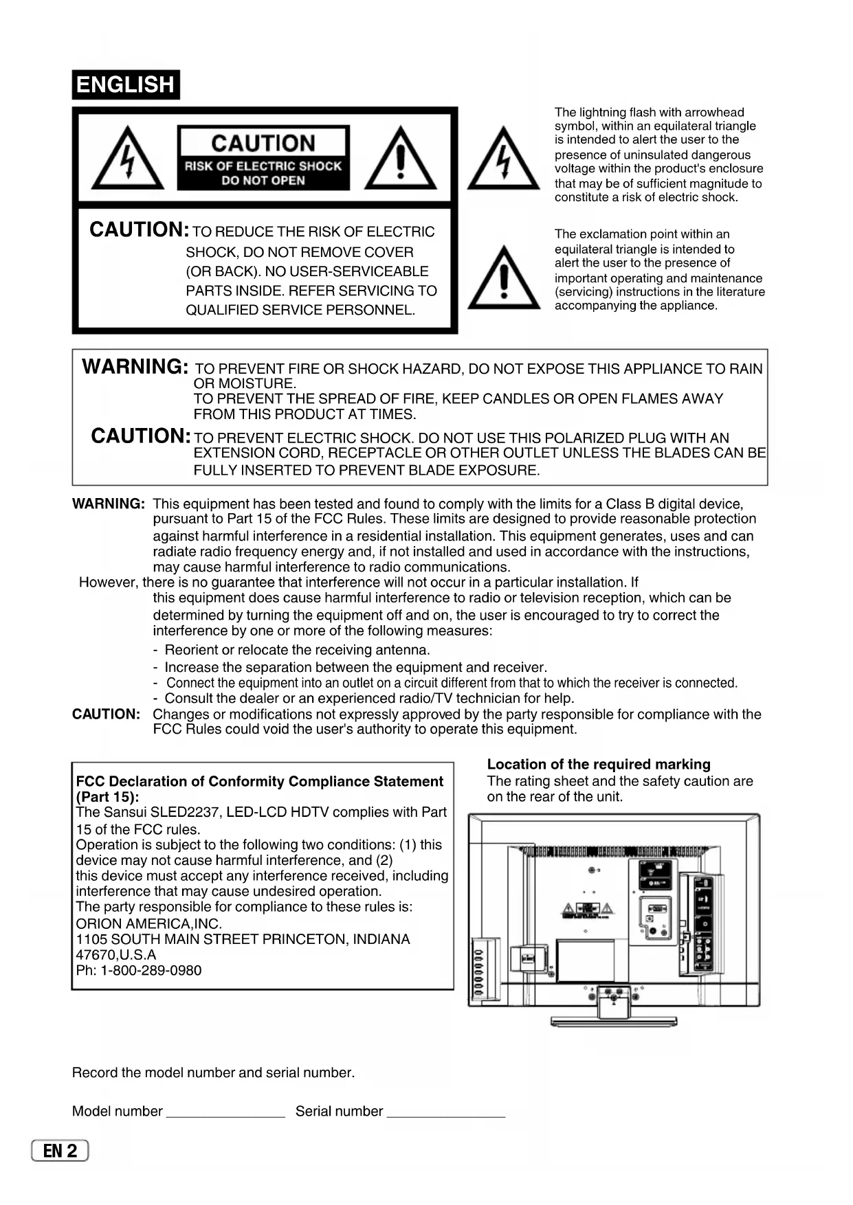 OR MOISTURE. TO PREVENT THE SPREAD OF FIRE, KEEP CANDLES OR OPEN FLAMES AWAY FROM THIS PRODUCT AT TIMES. CAUTION: TO PREVENT ELECTRIC SHOCK. DO NOT USE THIS POLARIZED PLUG WITH AN EXTENSION CORD, RECEPTACLE OR OTHER OUTLET UNLESS THE BLADES CAN BE FULLY INSERTED TO PREVENT BLADE EXPOSURE. Record the model number and serial number. Model number _______________ Serial number _______________ FCC Declaration of Conformity Compliance Statement (Part 15): The Sansui SLED2237, LED-LCD HDTV complies with Part 15 of the FCC rules. Operation is subject to the following two conditions: (1) this device may not cause harmful interference, and (2) this device must accept any interference received, including interference that may cause undesired operation. The party responsible for compliance to these rules is: ORION AMERICA,INC.