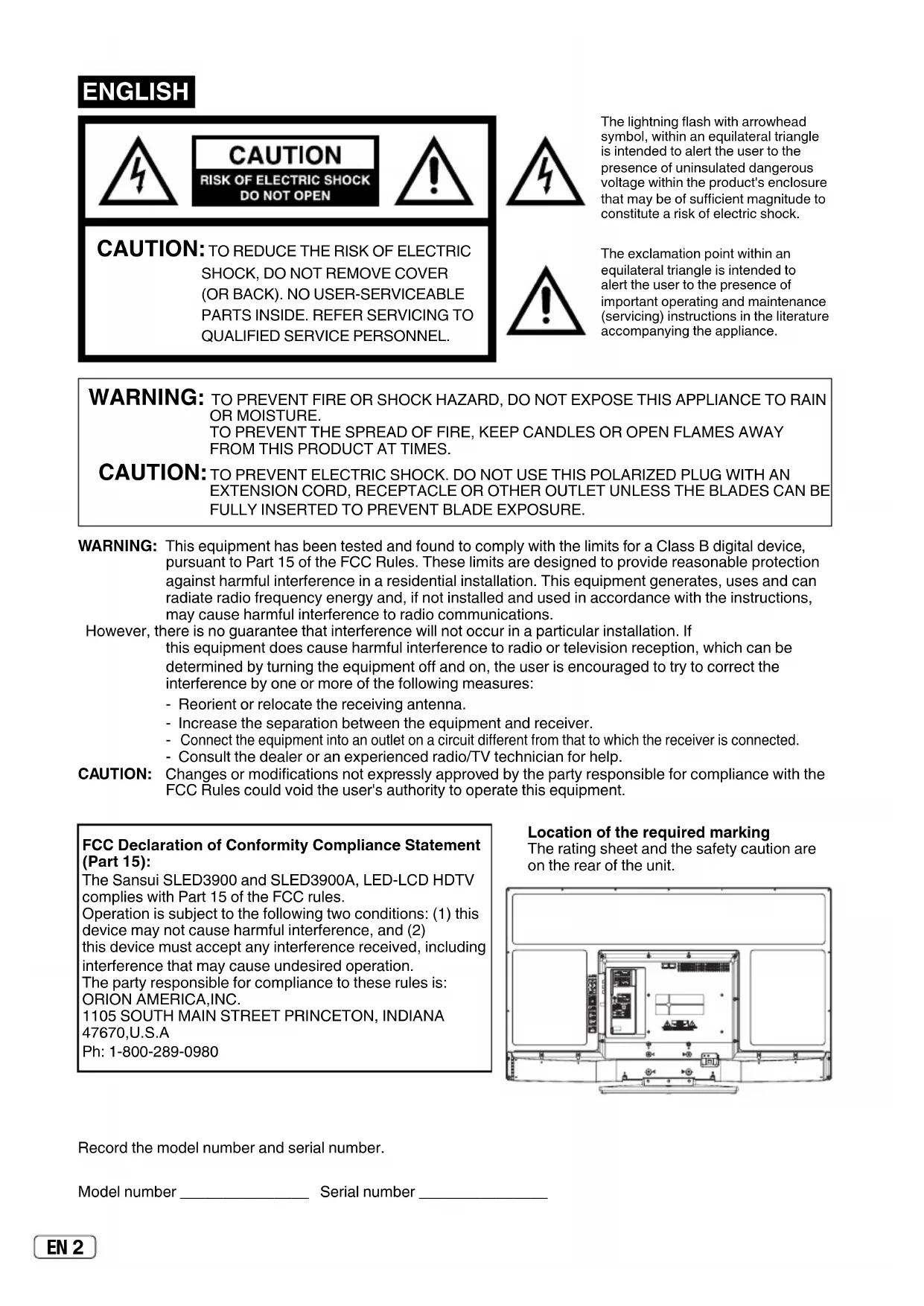 OR MOISTURE. TO PREVENT THE SPREAD OF FIRE, KEEP CANDLES OR OPEN FLAMES AWAY FROM THIS PRODUCT AT TIMES. CAUTION: TO PREVENT ELECTRIC SHOCK. DO NOT USE THIS POLARIZED PLUG WITH AN EXTENSION CORD, RECEPTACLE OR OTHER OUTLET UNLESS THE BLADES CAN BE FULLY INSERTED TO PREVENT BLADE EXPOSURE. Record the model number and serial number. Model number _______________ Serial number _______________ FCC Declaration of Conformity Compliance Statement (Part 15): The Sansui SLED3900 and SLED3900A, LED-LCD HDTV complies with Part 15 of the FCC rules. Operation is subject to the following two conditions: (1) this device may not cause harmful interference, and (2) this device must accept any interference received, including interference that may cause undesired operation. The party responsible for compliance to these rules is: ORION AMERICA,INC.