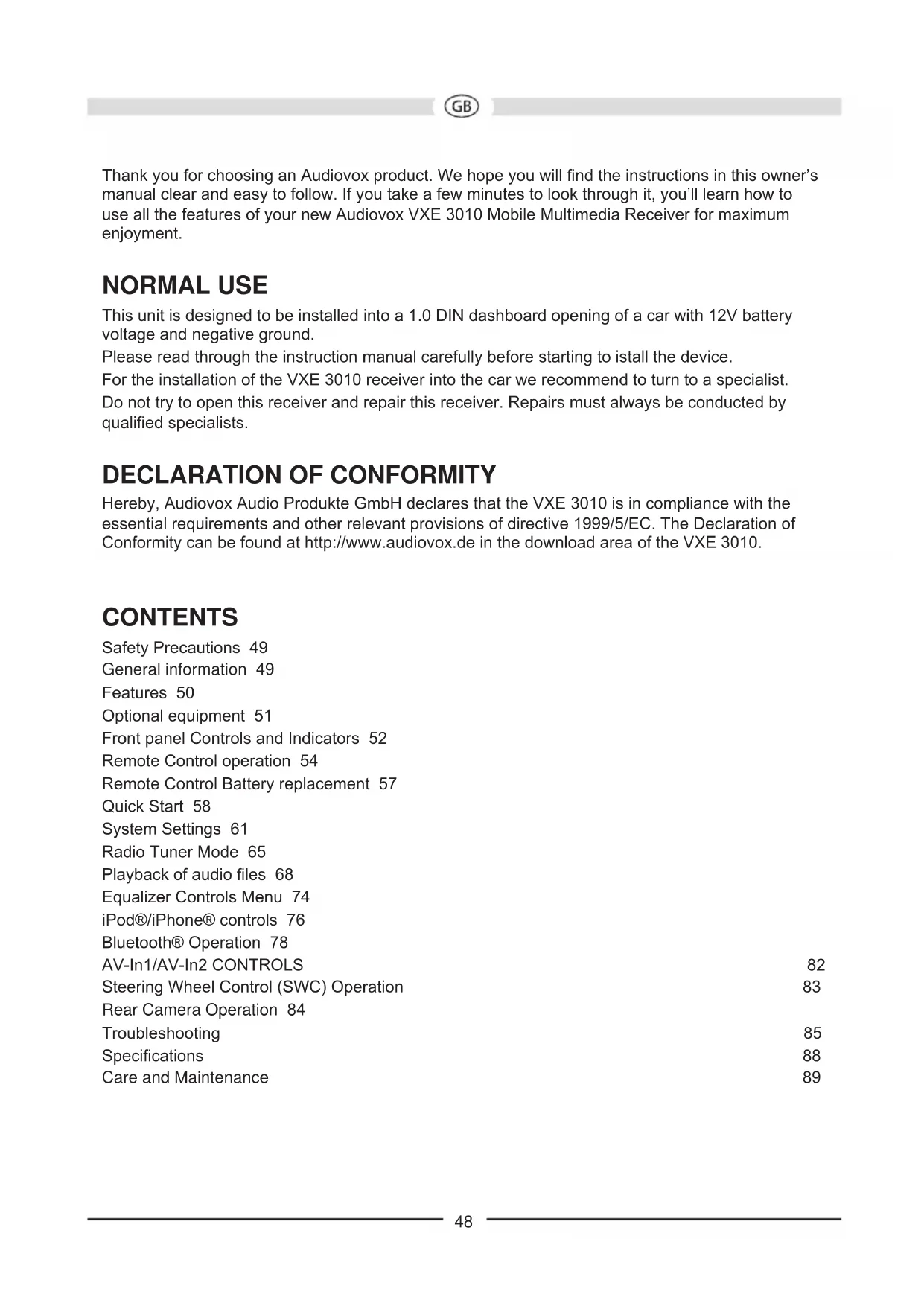 Hereby, Audiovox Audio Produkte GmbH declares that the VXE 3010 is in compliance with the essential requirements and other relevant provisions of directive 1999/5/EC. The Declaration of Conformity can be found at http://www.audiovox.de in the download area of the VXE 3010. CONTENTS Safety Precautions 49 General information 49 Features 50 Optional equipment 51 Front panel Controls and Indicators 52 Remote Control operation 54 Remote Control Battery replacement 57 Quick Start 58 System Settings 61 Radio Tuner Mode 65 Playback of audio les 68 Equalizer Controls Menu 74 iPod®/iPhone® controls 76 Bluetooth® Operation 78 AV-In1/AV-In2 CONTROLS 82 Steering Wheel Control (SWC) Operation 83 Rear Camera Operation 84 Troubleshooting 85 Specications 88 Care and Maintenance 89 48SAFETY PRECAUTIONS