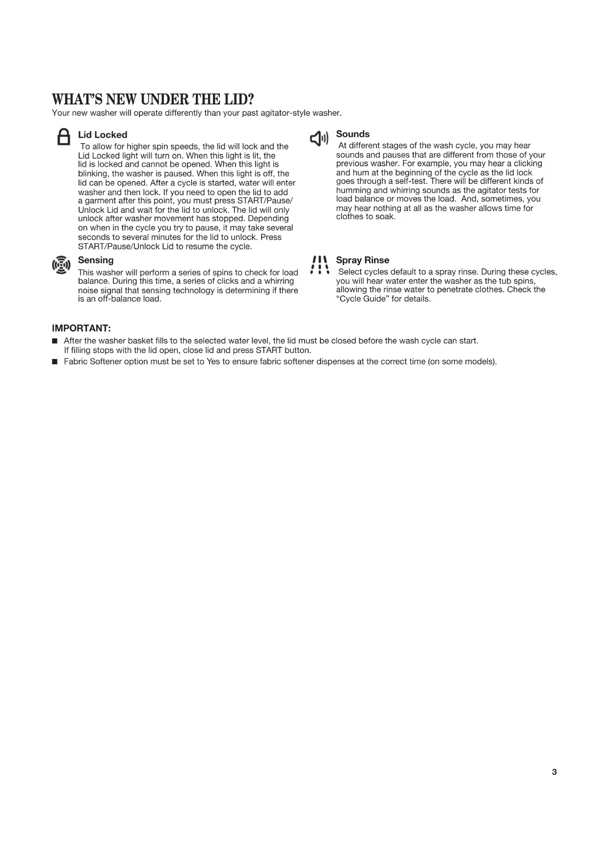 D’ENTRETIEN Para una versión de estas instrucciones en español, visite www.amana.com2 WASHER SAFETY3 Lid Locked To allow for higher spin speeds, the lid will lock and the Lid Locked light will turn on. When this light is lit, the lid is locked and cannot be opened. When this light is blinking, the washer is paused. When this light is off, the lid can be opened. After a cycle is started, water will enter washer and then lock. If you need to open the lid to add a garment after this point, you must press START/Pause/ Unlock Lid and wait for the lid to unlock. The lid will only unlock after washer movement has stopped. Depending on when in the cycle you try to pause, it may take several seconds to several minutes for the lid to unlock. Press START/Pause/Unlock Lid to resume the cycle. Sensing This washer will perform a series of spins to check for load balance. During this time, a series of clicks and a whirring noise signal that sensing technology is determining if there is an off-balance load. IMPORTANT: ■ After the washer basket lls to the selected water level, the lid must be closed before the wash cycle can start. If lling stops with the lid open, close lid and press START button. ■ Fabric Softener option must be set to Yes to ensure fabric softener dispenses at the correct time (on some models). Sounds At different stages of the wash cycle, you may hear sounds and pauses that are different from those of your previous washer. For example, you may hear a clicking and hum at the beginning of the cycle as the lid lock goes through a self-test. There will be different kinds of humming and whirring sounds as the agitator tests for load balance or moves the load. And, sometimes, you may hear nothing at all as the washer allows time for clothes to soak. Spray Rinse Select cycles default to a spray rinse. During these cycles, you will hear water enter the washer as the tub spins, allowing the rinse water to penetrate clothes. Check the “Cycle Guide” for details. WHAT’S NEW UNDER THE LID? Your new washer will operate differently than your past agitator-style washer.4 LOAD SIZE Select the setting most suitable for your load. Ex small or Small (depending on model) will add a low amount of water for smaller loads and Large will add the most amount of water for large or bulky loads. Items need to move freely. Tightly packing can lead to poor cleaning performance, and may increase wrinkling and tangling. WASH TEMPERATURE Temperature senses and maintains uniform water temperatures by regulating incoming hot and cold water. Select a wash temperature based on the type of fabric and soils being washed. For best results and following the garment label instructions, use the warmest wash water safe for your fabric. ■ On some models and cycles, warm and hot water may be cooler than your previous washer. ■ Even in a cold and cool water wash, some warm water may be added to the washer to maintain a minimum temperature. FABRIC SOFTENER (on some models) This option can be added to most cycles and must be set to YES if using fabric softener during a cycle. It ensures that fabric softener is added at the correct time in the rinse for even distribution.