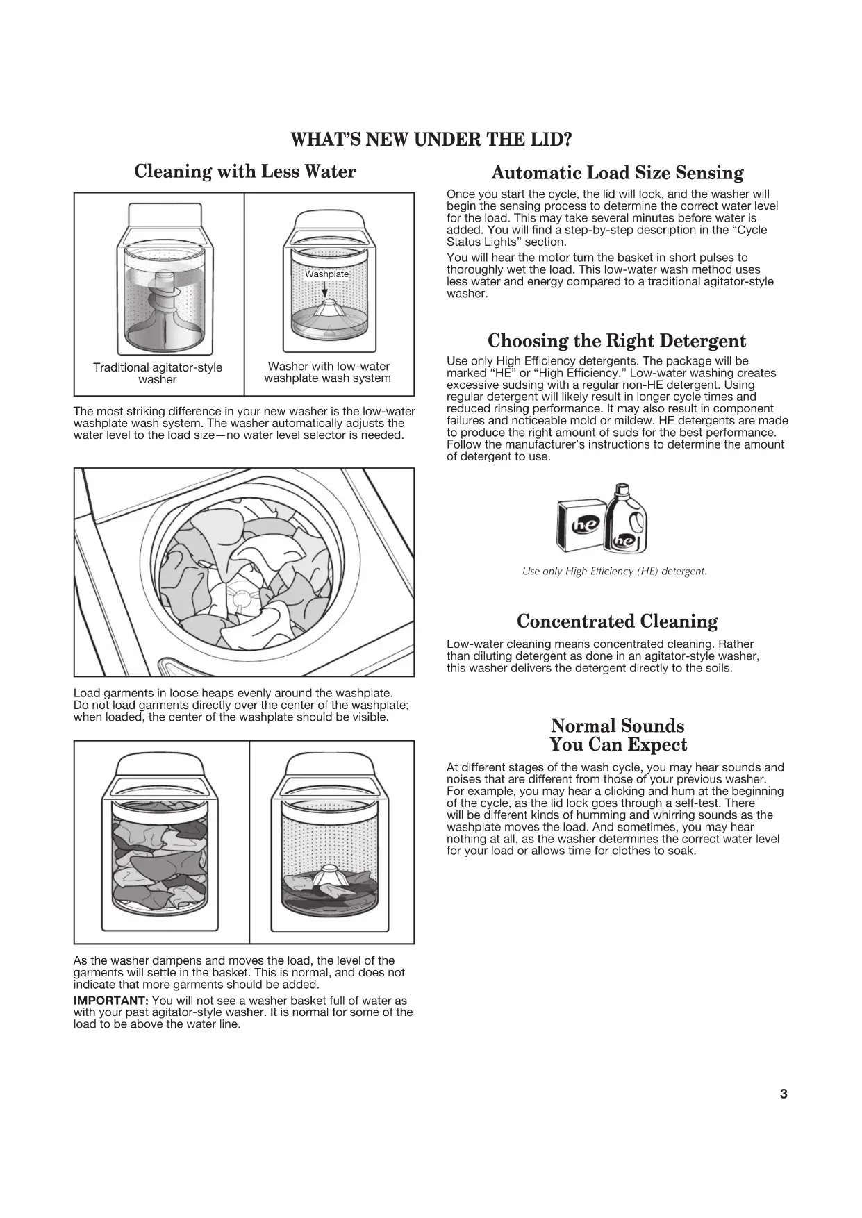 Para una versión de estas instrucciones en español, visite www.amana.com2 WASHER SAFETY3 Load garments in loose heaps evenly around the washplate. Do not load garments directly over the center of the washplate; when loaded, the center of the washplate should be visible. As the washer dampens and moves the load, the level of the garments will settle in the basket. This is normal, and does not indicate that more garments should be added. IMPORTANT: You will not see a washer basket full of water as with your past agitator-style washer. It is normal for some of the load to be above the water line. WHAT’S NEW UNDER THE LID? Choosing the Right Detergent Use only High Efciency detergents. The package will be marked “HE” or “High Efciency.” Low-water washing creates excessive sudsing with a regular non-HE detergent. Using regular detergent will likely result in longer cycle times and reduced rinsing performance. It may also result in component failures and noticeable mold or mildew. HE detergents are made to produce the right amount of suds for the best performance. Follow the manufacturer’s instructions to determine the amount of detergent to use. Normal Sounds You Can Expect At different stages of the wash cycle, you may hear sounds and noises that are different from those of your previous washer. For example, you may hear a clicking and hum at the beginning of the cycle, as the lid lock goes through a self-test. There will be different kinds of humming and whirring sounds as the washplate moves the load. And sometimes, you may hear nothing at all, as the washer determines the correct water level for your load or allows time for clothes to soak. Use only High Efciency (HE) detergent. Concentrated Cleaning Low-water cleaning means concentrated cleaning. Rather than diluting detergent as done in an agitator-style washer, this washer delivers the detergent directly to the soils. Cleaning with Less Water The most striking difference in your new washer is the low-water washplate wash system. The washer automatically adjusts the water level to the load size—no water level selector is needed. Traditional agitator-style washer Washer with low-water washplate wash system Washplate Automatic Load Size Sensing Once you start the cycle, the lid will lock, and the washer will begin the sensing process to determine the correct water level for the load. This may take several minutes before water is added. You will nd a step-by-step description in the “Cycle Status Lights” section. You will hear the motor turn the basket in short pulses to thoroughly wet the load. This low-water wash method uses less water and energy compared to a traditional agitator-style washer. Washplate4