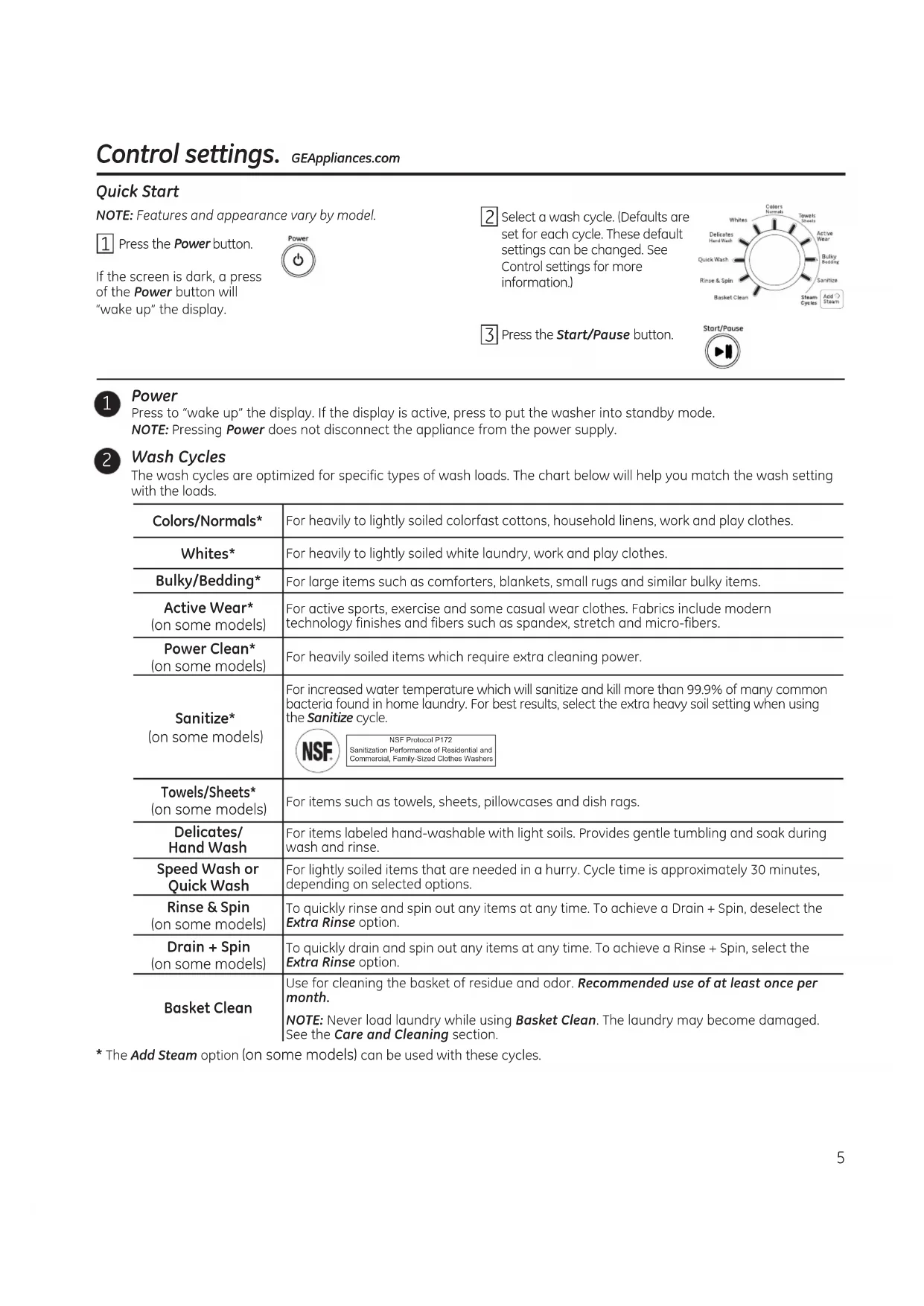 (on some models) To quickly drain and spin out any items at any time. To achieve a Rinse + Spin, select the Extra Rinse option. Basket Clean Use for cleaning the basket of residue and odor. Recommended use of at least once per month. NOTE: Never load laundry while using Basket Clean. The laundry may become damaged. See the Care and Cleaning section. Wash Cycles The wash cycles are optimized for specific types of wash loads. The chart below will help you match the wash setting with the loads.NOTE: Features and appearance vary by model. Quick Start