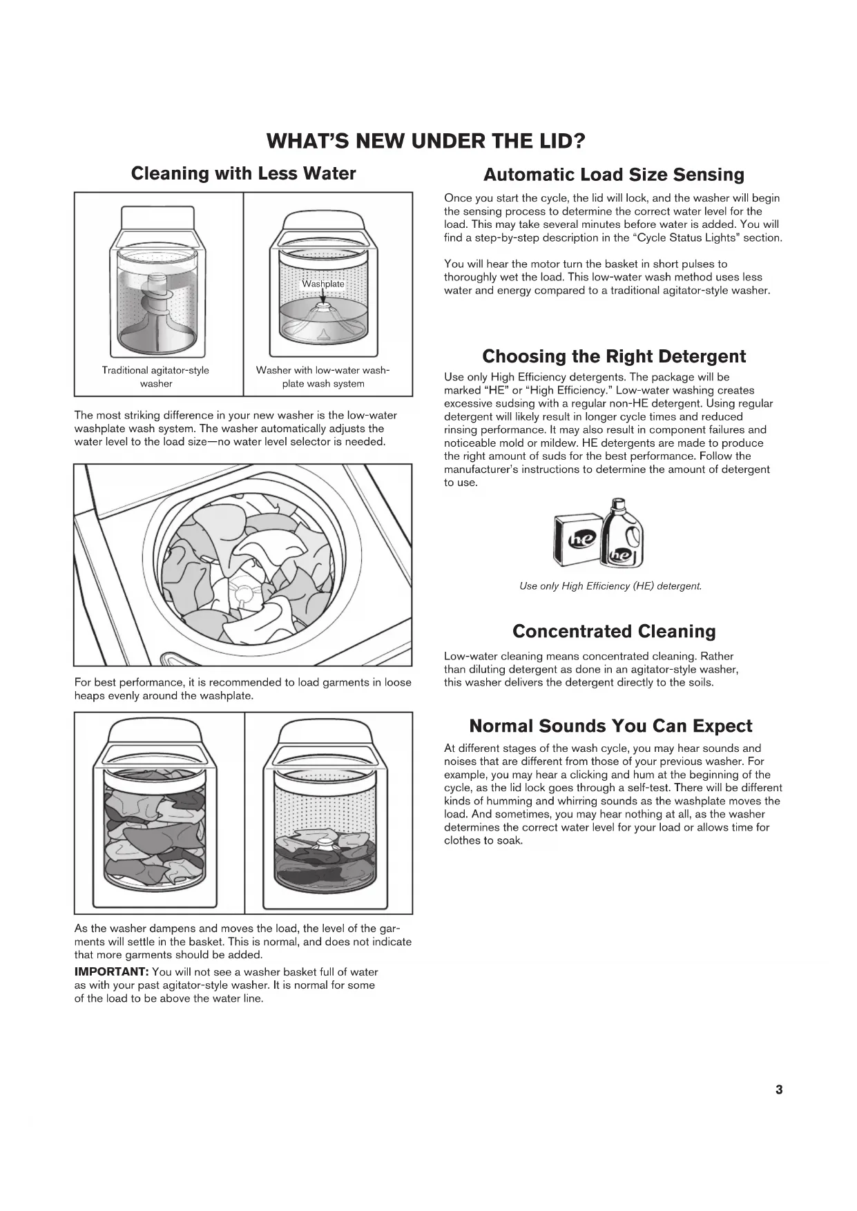 LE DESSUS Para una versión de estas instrucciones en español, visite www.maytag.com2 WASHER SAFETY3 WHAT’S NEW UNDER THE LID? Choosing the Right Detergent Use only High Efficiency detergents. The package will be marked “HE” or “High Efficiency.” Low-water washing creates excessive sudsing with a regular non-HE detergent. Using regular detergent will likely result in longer cycle times and reduced rinsing performance. It may also result in component failures and noticeable mold or mildew. HE detergents are made to produce the right amount of suds for the best performance. Follow the manufacturer’s instructions to determine the amount of detergent to use. Normal Sounds You Can Expect At different stages of the wash cycle, you may hear sounds and noises that are different from those of your previous washer. For example, you may hear a clicking and hum at the beginning of the cycle, as the lid lock goes through a self-test. There will be different kinds of humming and whirring sounds as the washplate moves the load. And sometimes, you may hear nothing at all, as the washer determines the correct water level for your load or allows time for clothes to soak. Use only High Efficiency (HE) detergent. Concentrated Cleaning Low-water cleaning means concentrated cleaning. Rather than diluting detergent as done in an agitator-style washer, this washer delivers the detergent directly to the soils. Cleaning with Less Water The most striking difference in your new washer is the low-water washplate wash system. The washer automatically adjusts the water level to the load size—no water level selector is needed. Traditional agitator-style washer Washer with low-water wash- plate wash system Washplate Automatic Load Size Sensing Once you start the cycle, the lid will lock, and the washer will begin the sensing process to determine the correct water level for the load. This may take several minutes before water is added. You will find a step-by-step description in the “Cycle Status Lights” section. You will hear the motor turn the basket in short pulses to thoroughly wet the load. This low-water wash method uses less water and energy compared to a traditional agitator-style washer. As the washer dampens and moves the load, the level of the gar- ments will settle in the basket. This is normal, and does not indicate that more garments should be added. IMPORTANT: You will not see a washer basket full of water as with your past agitator-style washer. It is normal for some of the load to be above the water line. For best performance, it is recommended to load garments in loose heaps evenly around the washplate.4