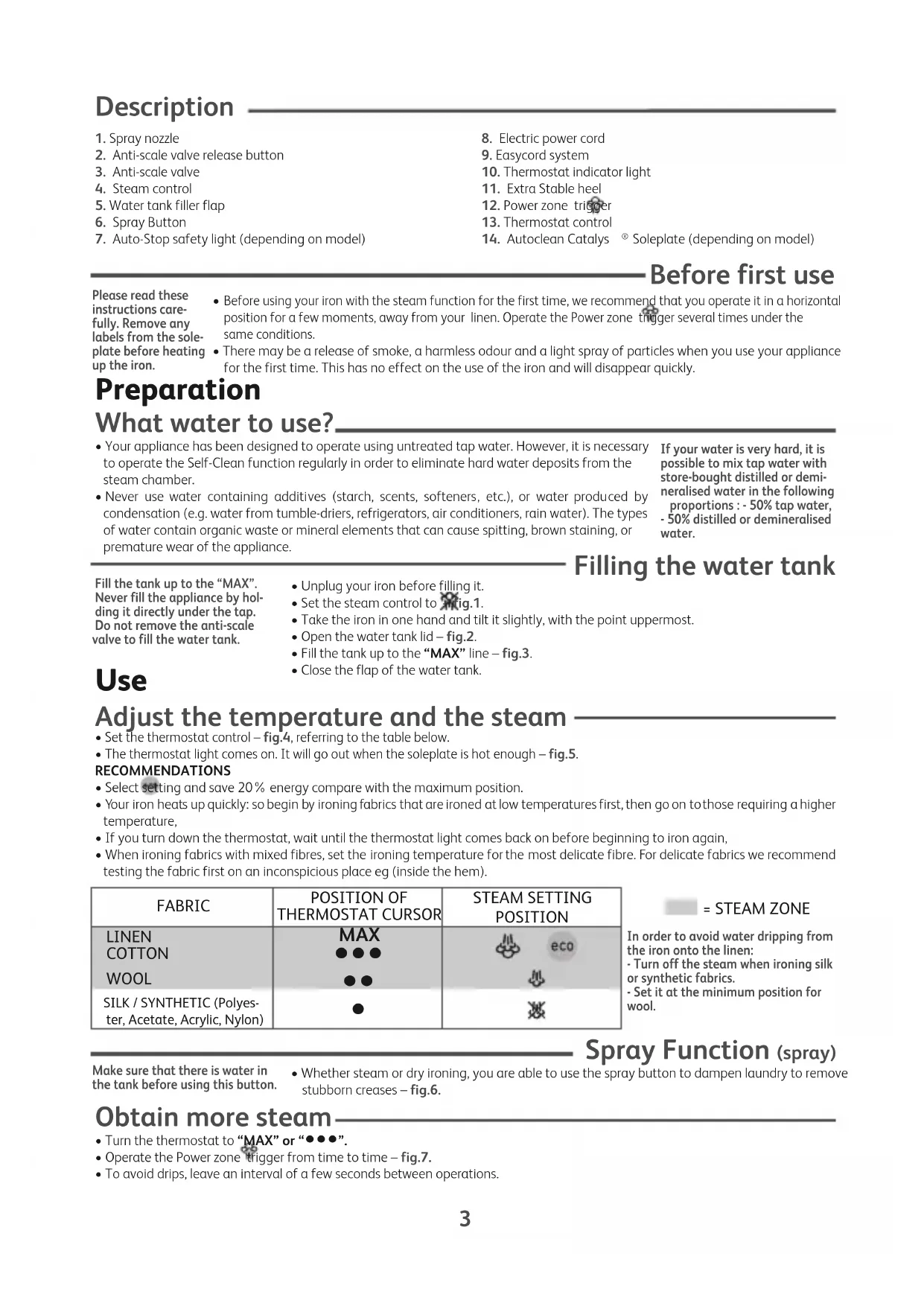 Spray Function (spray) • Whether steam or dry ironing, you are able to use the spray button to dampen laundry to removestubborn creases – fig.6. Obtain more steam • Turn the thermostat to “MAX” or “•••”.• Operate the Power zone trigger from time to time – fig.7.• To avoid drips, leave an interval of a few seconds between operations.Fill the tank up to the “MAX”.Never fill the appliance by hol-ding it directly under the tap.Do not remove the anti-scalevalve to fill the water tank.If your water is very hard, it ispossible to mix tap water withstore-bought distilled or demi-neralised water in the following proportions : - 50% tap water,- 50% distilled or demineralisedwater.= STEAM ZONEIn order to avoid water dripping fromthe iron onto the linen:- Turn off the steam when ironing silkor synthetic fabrics.- Set it at the minimum position forwool.Make sure that there is water inthe tank before using this button.FABRICPOSITION OFTHERMOSTAT CURSORSTEAM SETTINGPOSITIONLINENCOTTON WOOL SILK / SYNTHETIC (Polyes-ter, Acetate, Acrylic, Nylon) MAX