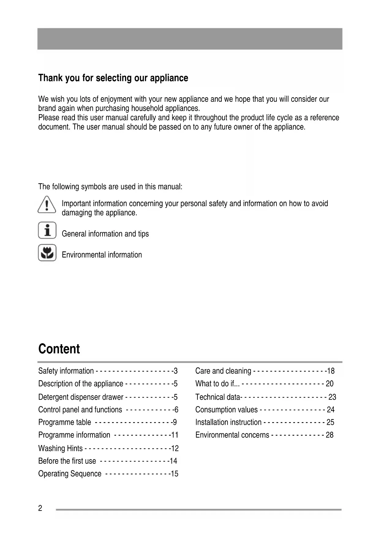 User Manual Notice d’utilisation Washing Machine Lave-linge ZWH 6145 192997920_GB.qxd 14/12/2007 17.09 Pagina 12 Content Safety information - - - - - - - - - - - - - - - - - - -3 Description of the appliance - - - - - - - - - - - -5 Detergent dispenser drawer - - - - - - - - - - - -5 Control panel and functions - - - - - - - - - - - -6 Programme table - - - - - - - - - - - - - - - - - - -9 Programme information - - - - - - - - - - - - - -11 Washing Hints - - - - - - - - - - - - - - - - - - - - -12 Before the first use - - - - - - - - - - - - - - - - -14 Operating Sequence - - - - - - - - - - - - - - - -15 Care and cleaning - - - - - - - - - - - - - - - - - -18 What to do if... - - - - - - - - - - - - - - - - - - - - 20 Technical data- - - - - - - - - - - - - - - - - - - - - 23 Consumption values - - - - - - - - - - - - - - - - 24 Installation instruction - - - - - - - - - - - - - - - 25 Environmental concerns - - - - - - - - - - - - - 28 Thank you for selecting our appliance We wish you lots of enjoyment with your new appliance and we hope that you will consider our brand again when purchasing household appliances. Please read this user manual carefully and keep it throughout the product life cycle as a reference document. The user manual should be passed on to any future owner of the appliance. The following symbols are used in this manual: Important information concerning your personal safety and information on how to avoid damaging the appliance. General information and tips Environmental information 192997920_GB.qxd 14/12/2007 17.09 Pagina 23 Safety information In the interest of your safety and to ensure the correct use, before installing and first using the appliance, read this user manual carefully, including its hints and warnings. To avoid unnecessary mistakes and accidents, it is important to ensure that all people using the appliance are thoroughly familiar with its operation and safety features. Save these instructions and make sure that they remain with the appliance if it is moved or sold, so that everyone using it through its life will be properly informed on appliance use and safety. General safety ● It is dangerous to alter the specifications or attempt to modify this product in any way. ● During high temperature wash programmes the door glass may get hot. Do not touch it! ● Make sure that small pets do not climb into the drum. To avoid this, please check into the drum before using. ● Any objects such as coins, safety pins, nails, screws, stones or any other hard, sharp material can cause extensive damage and must not be placed into the machine. ● Only use the advised quantities of fabric softener and detergent. Damage to the fabric can ensue if you over-fill. Refer to the manufacturer’s recommendations of quantities. ● Wash small items such as socks, laces, washable belts etc in a washing bag or pillow case as it is possible for such items to slip down between the tub and the inner drum. ● Do not use your washing machine to wash articles with whalebones, material without hems or torn material. ● Always unplug the appliance and turn off the water supply after use, clean and maintenance. ● Under no circumstances should you attempt to repair the machine yourself. Repairs carried out by inexperienced persons may cause injury or serious malfunctioning. Contact your local Service Centre. Always insist on genuine spare parts. Installation ● This appliance is heavy. Care should be taken when moving it. ● When unpacking the appliance, check that it is not damaged. If in doubt, do not use it and contact the Service Centre. ● All packing and transit bolts must be removed before use. Serious damage can occur to the product and to property if this is not adhered to. See relevant section in the user manual. ● After having installed the appliance, check that it is not standing on the inlet and drain hose and the worktop is not pressing the electrical supply cable. ● If the machine is situated on a carpeted floor, please adjust the feet in order to allow air to circulate freely ● Always be sure, that there is no water leakage from hoses and their connections after the installation. ● If the appliance is installed in a location subject to frost, please read the «dangers of freezing» chapter. ● Any plumbing work required to install this appliance should be carried out by a qualified plumber or competent person. ● Any electrical work required to install this appliance should be carried out by a qualified electrician or competent person. 192997920_GB.qxd 14/12/2007 17.09 Pagina 34 Use ● This appliance is designed for domestic use. It must not be used for purposes other than those for which it was designed. ● Only wash fabrics which are designed to be machine washed. Follow the instructions on each garment label. ● Do not overload the appliance. See the relevant section in the user manual. ● Before washing, ensure that all pockets are empty and buttons and zips are fastened. Avoid washing frayed or torn articles and treat stains such as paint, ink, rust, and grass before washing. Underwired bras must NOT be machine washed. ● Garments which have been in contact with volatile petroleum products should not be machine washed. If volatile cleaning fluids are used, care should be taken to ensure that the fluid is removed from the garment before placing in the machine. ● Never pull the power supply cable to remove the plug from the socket; always take hold of the plug itself. ● Never use the washing machine if the power supply cable, the control panel, the working surface or the base are damaged so that the inside of the washing machine is accessible. Child safety ● This washing machine is not intended for use by young children or infirm persons without supervision. ● Young children should be supervised to ensure that they do not play with the appliance. ● The packaging components (e.g. plastic film, polystyrene) can be dangerous to chi