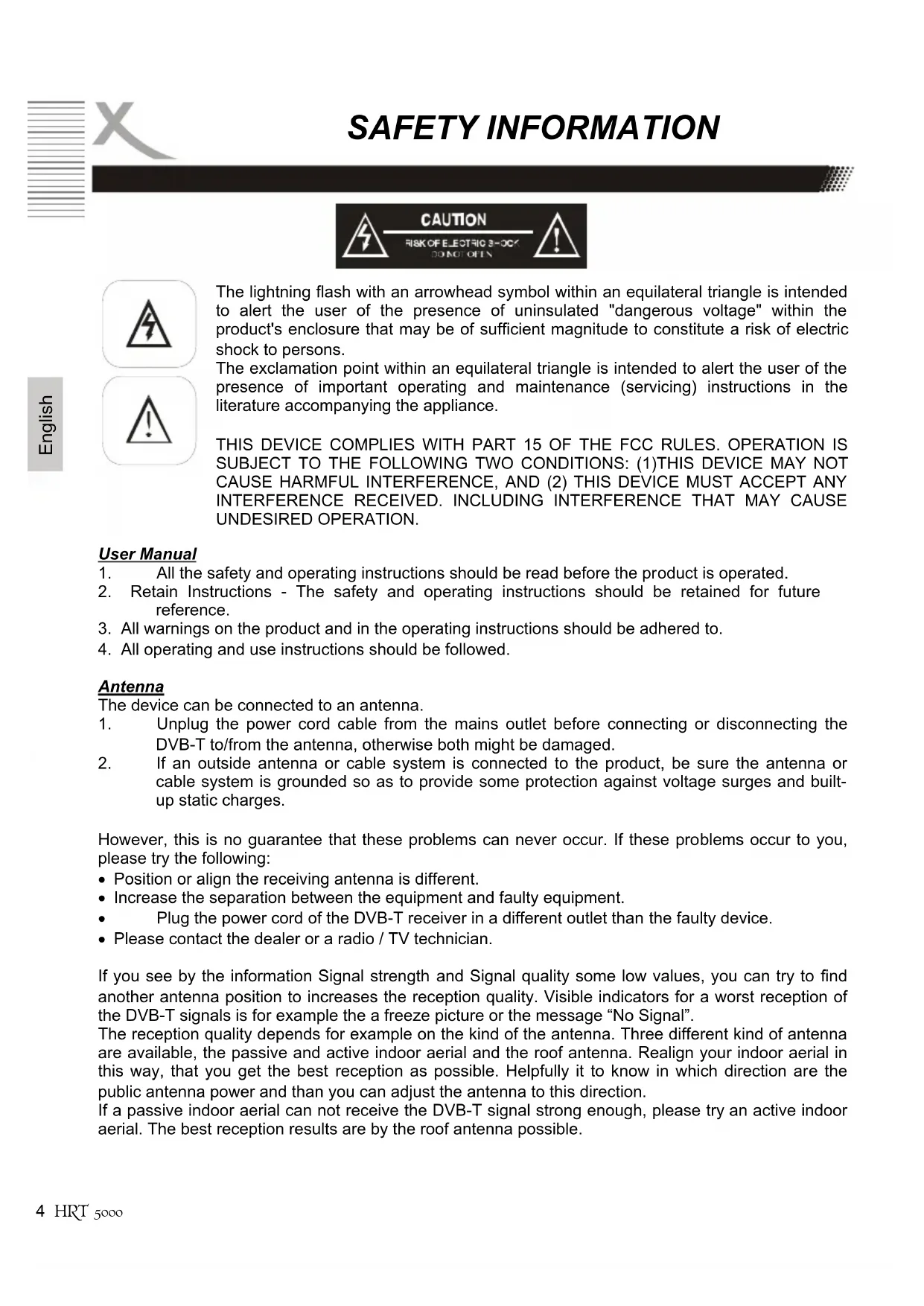 - Please contact the dealer or a radio / TV technician. If you see by the information Signal strength and Signal quality some low values, you can try to find another antenna position to increases the reception quality. Visible indicators for a worst reception of the DVB-T signals is for example the a freeze picture or the message “No Signal”. The reception quality depends for example on the kind of the antenna. Three different kind of antenna are available, the passive and active indoor aerial and the roof antenna. Realign your indoor aerial in this way, that you get the best reception as possible. Helpfully it to know in which direction are the public antenna power and than you can adjust the antenna to this direction. If a passive indoor aerial can not receive the DVB-T signal strong enough, please try an active indoor aerial. The best reception results are by the roof antenna possible.HRT 5000 5 English SAFETY INFORMATION Power Supply
