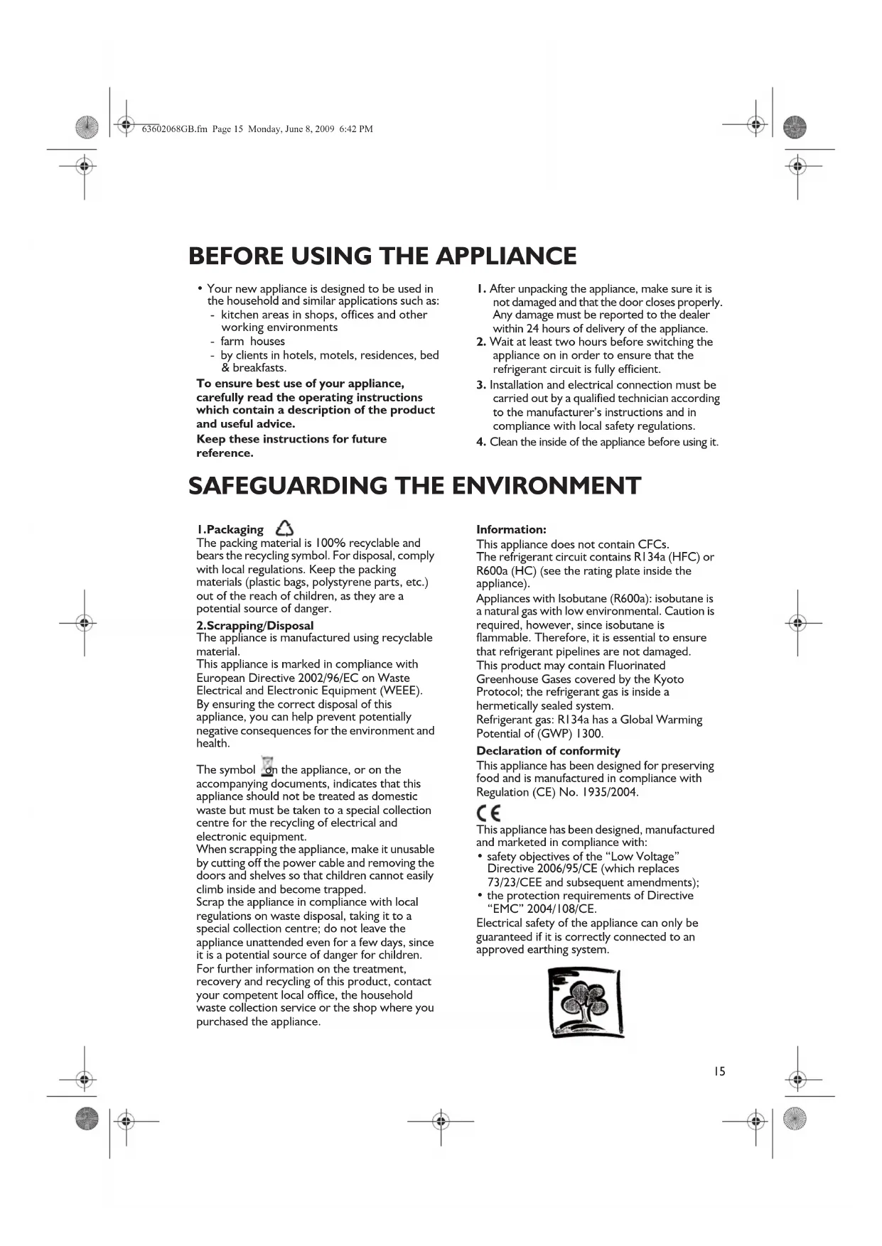 BEFORE USING THE APPLIANCE SAFEGUARDING THE ENVIRONMENT