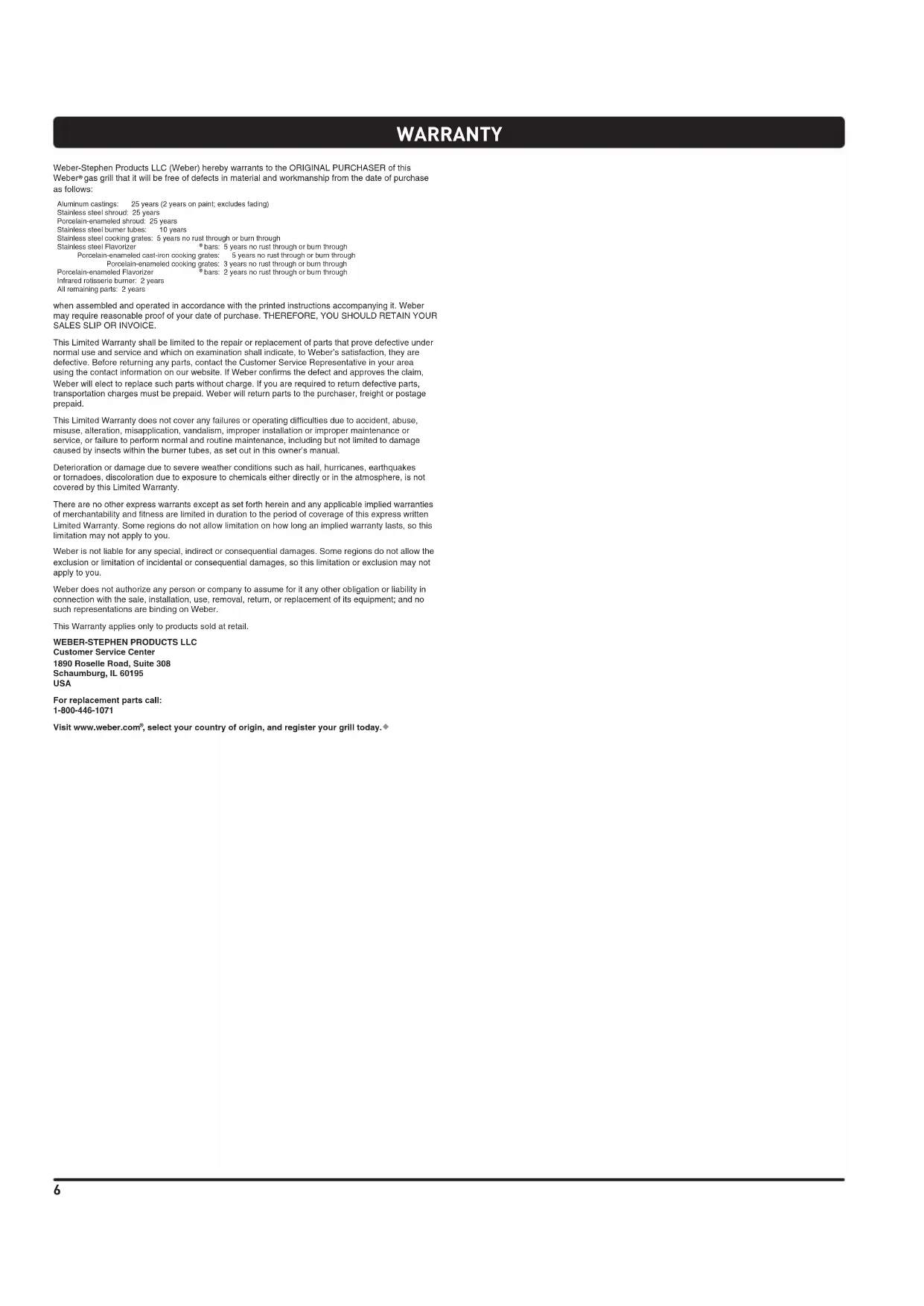 bars: 2 years no rust through or burn through Infrared rotisserie burner: 2 years All remaining parts: 2 years when assembled and operated in accordance with the printed instructions accompanying it. Weber may require reasonable proof of your date of purchase. THEREFORE, YOU SHOULD RETAIN YOUR SALES SLIP OR INVOICE. This Limited Warranty shall be limited to the repair or replacement of parts that prove defective under normal use and service and which on examination shall indicate, to Weber’s satisfaction, they are defective. Before returning any parts, contact the Customer Service Representative in your area using the contact information on our website. If Weber confirms the defect and approves the claim, Weber will elect to replace such parts without charge. If you are required to return defective parts, transportation charges must be prepaid. Weber will return parts to the purchaser, freight or postage prepaid. This Limited Warranty does not cover any failures or operating difficulties due to accident, abuse, misuse, alteration, misapplication, vandalism, improper installation or improper maintenance or service, or failure to perform normal and routine maintenance, including but not limited to damage caused by insects within the burner tubes, as set out in this owner’s manual. Deterioration or damage due to severe weather conditions such as hail, hurricanes, earthquakes or tornadoes, discoloration due to exposure to chemicals either directly or in the atmosphere, is not covered by this Limited Warranty. There are no other express warrants except as set forth herein and any applicable implied warranties of merchantability and fitness are limited in duration to the period of coverage of this express written Limited Warranty. Some regions do not allow limitation on how long an implied warranty lasts, so this limitation may not apply to you. Weber is not liable for any special, indirect or consequential damages. Some regions do not allow the exclusion or limitation of incidental or consequential damages, so this limitation or exclusion may not apply to you. Weber does not authorize any person or company to assume for it any other obligation or liability in connection with the sale, installation, use, removal, return, or replacement of its equipment; and no such representations are binding on Weber. This Warranty applies only to products sold at retail.
